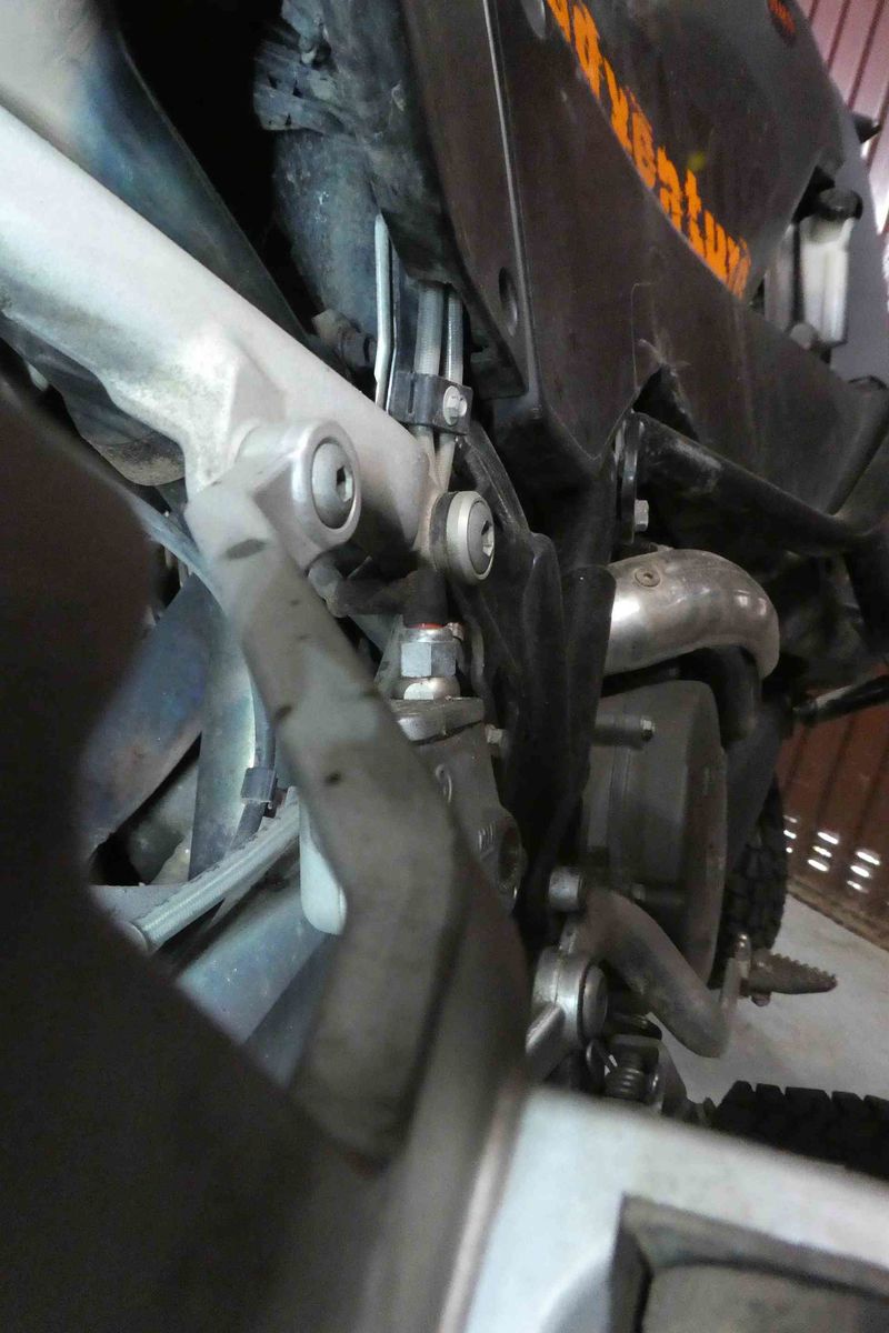 Das Hitzeschutzblech für die hintere(n) Bremsleitung(en) gibt es bei der 990ADV mit ABS. Es ist oberhalb des Gebers der Hinterradbremse am dortigen ABS-Bremsleitungshalter verschraubt. Man kann es vermutlich an die 950er oder auch an eine 990R (also ohne ABS) adaptieren, indem man einen passenden Halter bastelt.