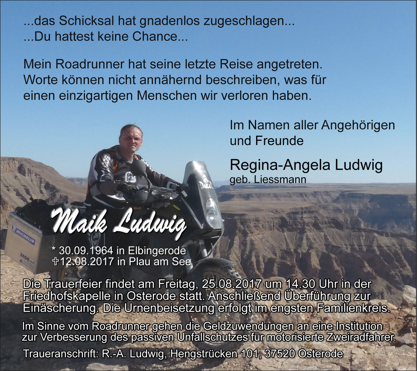 Die Trauerfeier für meinen Roadrunner findet statt am Freitag, 25.08.17, 14:30 Uhr, in der Friedhofskapelle in 37520 Osterode, Scheerenberger Straße 14. Wer dem Roadrunner das letzte Geleit geben möchte, kann das gern machen. Die Urnenbeisetzung erfolgt zu einem späteren Zeitpunkt im engsten Familienkreis.