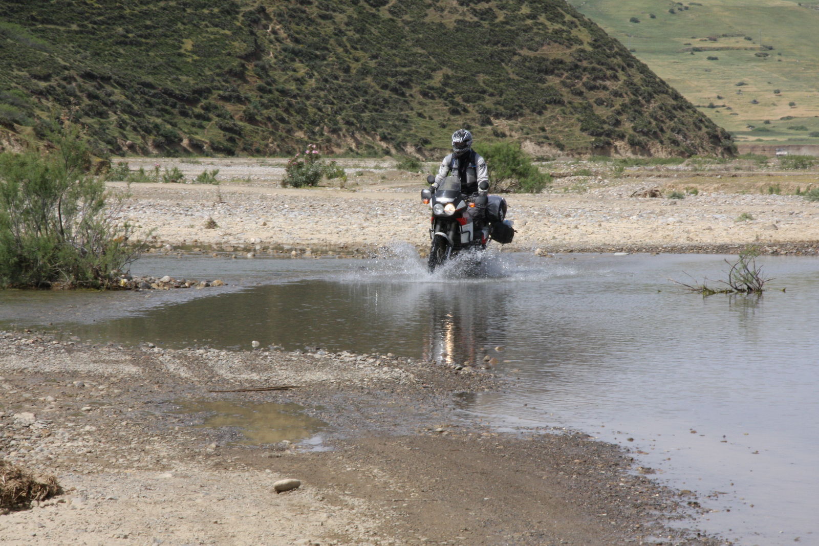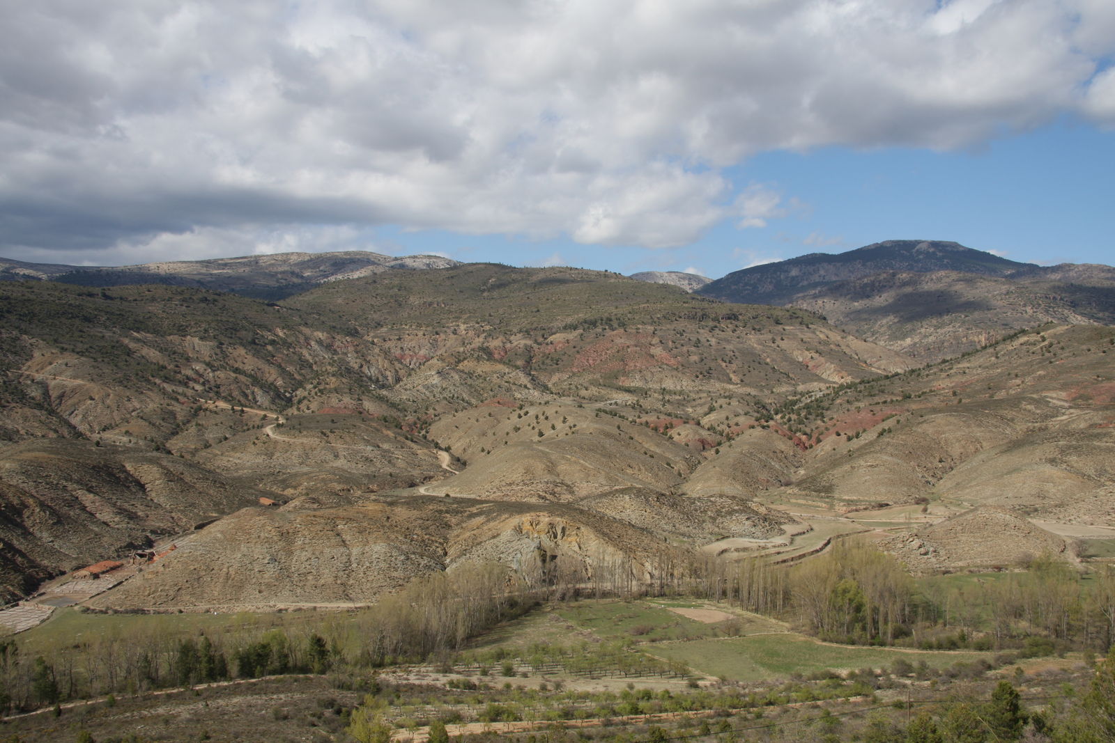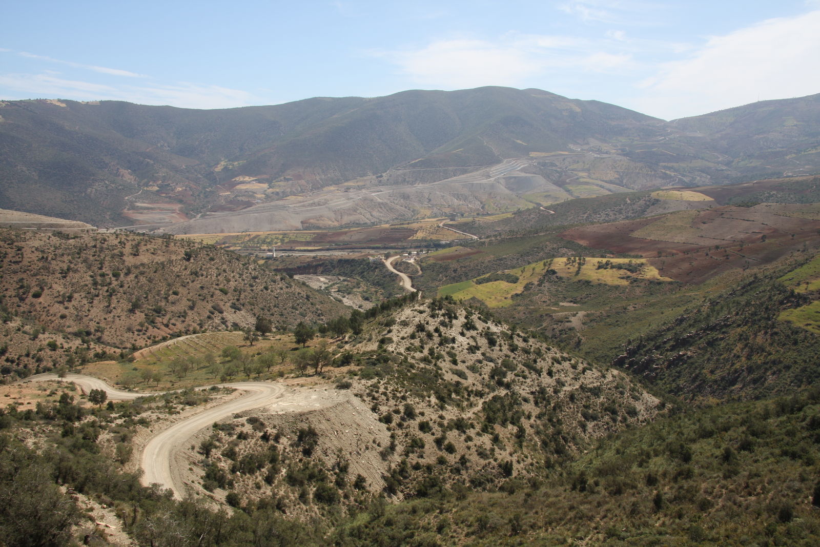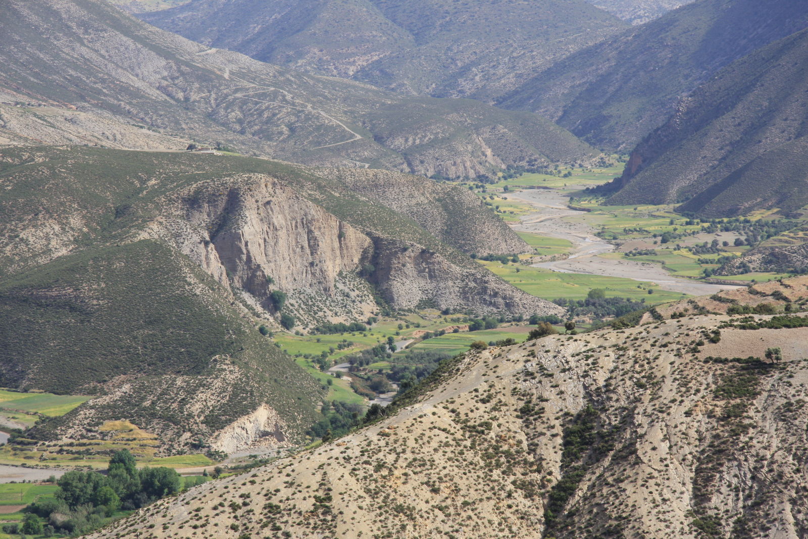 | Fruchtbares Tal, trockene Höhen und unten eine kleine Straße, mal mit, mal ohne Asphalt. |