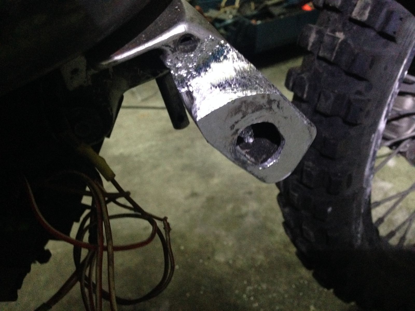 nachdem ich meine Tanks, besonders den rechten, nur mit Gewalt und ohne die innere, untere Metallhuelse montieren konnte, habe ich mal bischen gebohrt und geschliffen. Langloch fuer die Verschraubung, und oben an dem Ausleger Material weggeschliffen, da dort der Schlauch zwischen den Tanks schon arg fest auflag. Jetzt klappts auch wieder ohne Gewalt Wink