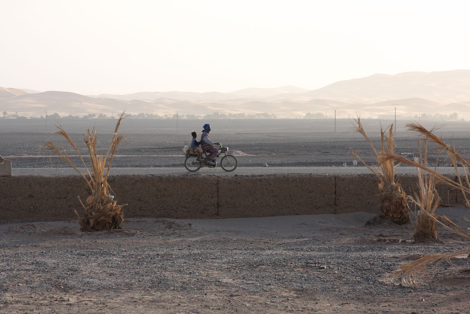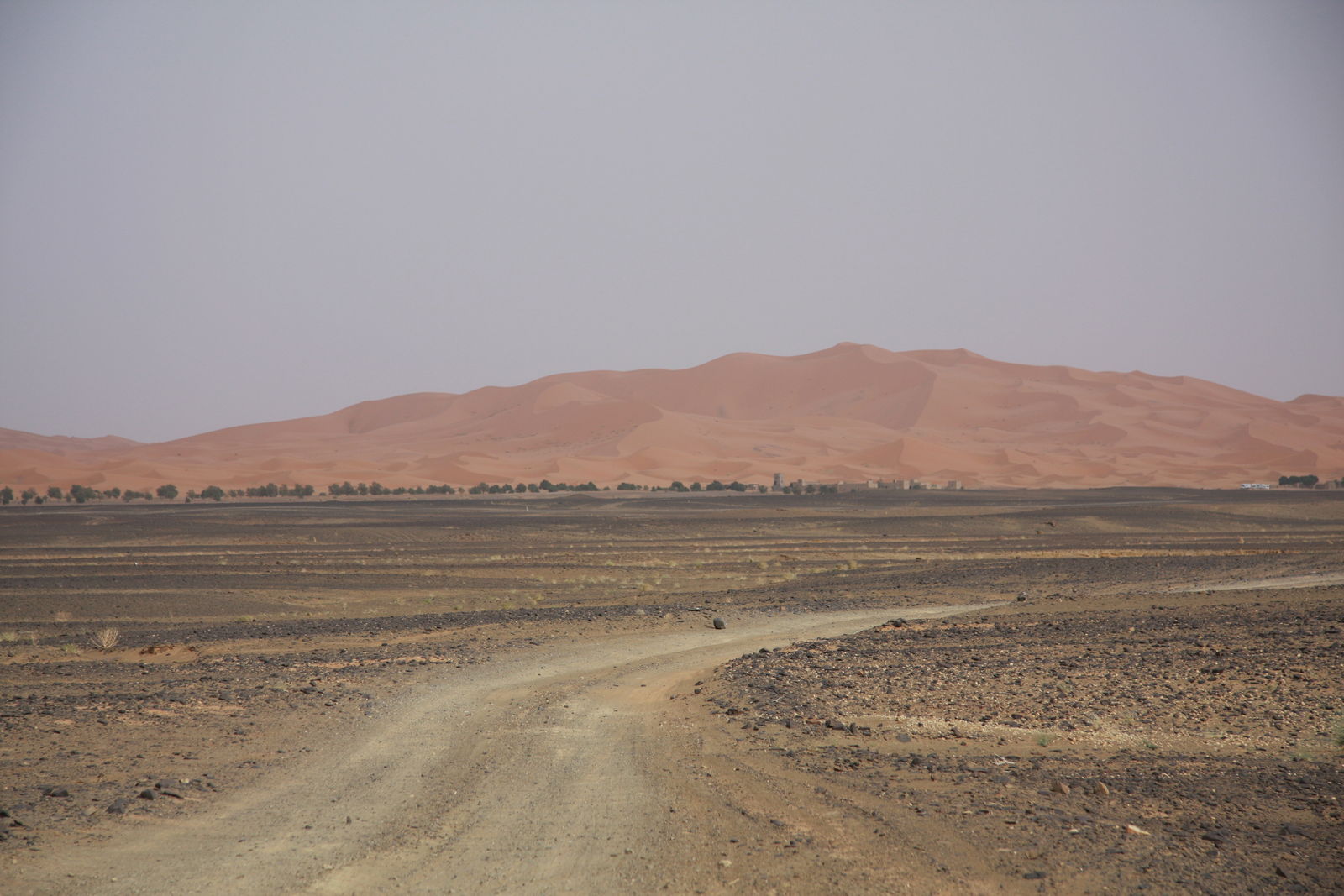 | Erg Chebbi im Dunst, davor einige Hotels von Merzouga |