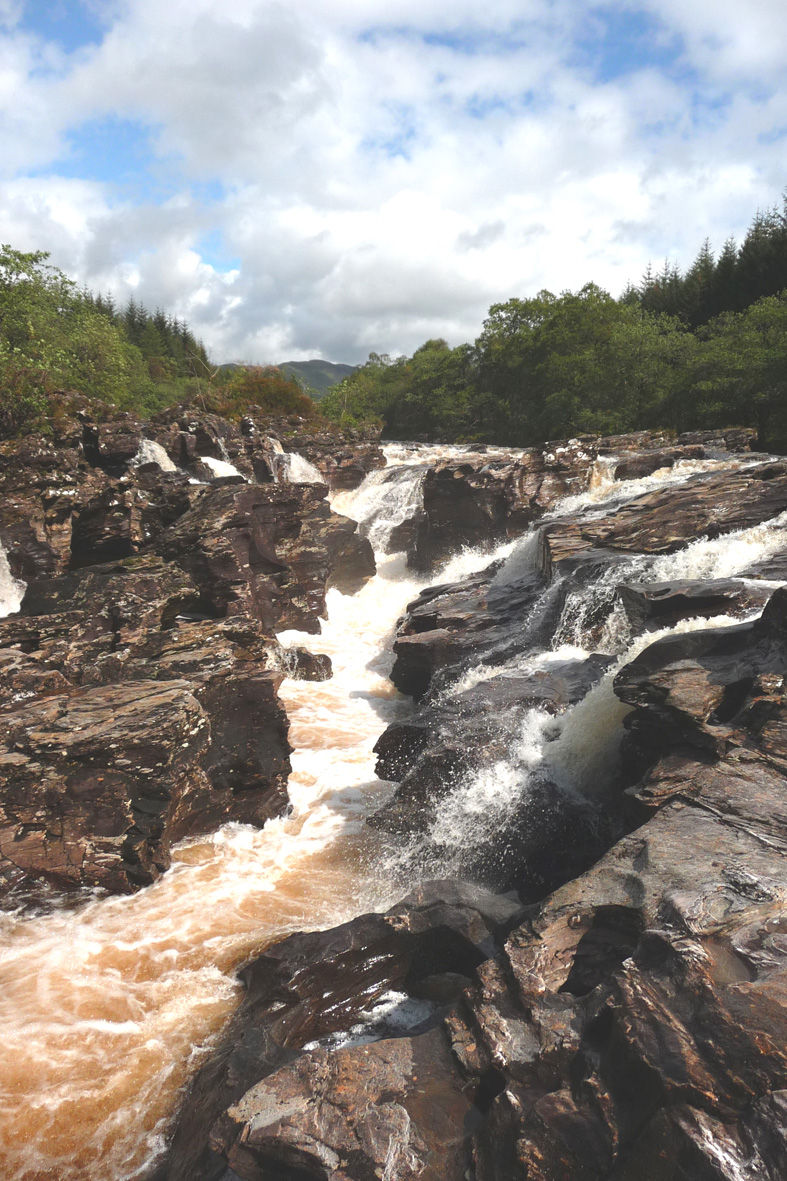 Glen Orchy - im unteren Teil weitet sich das Flussbett und die Strasse führt durch die dichten Bäume am Ufer.
