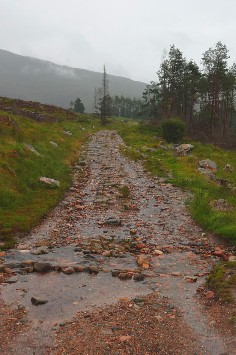 West Highland Way. Wie Thommy, der Wirt des Hostels ind Glen Coe, sagte, muss man nicht alles fahren. Es sei denn, es stört keinen wenn man es trotzdem tut.Die Strecke von Blàr a´Charoinn nach Kinlochleven bei einem dezenten Landregen.