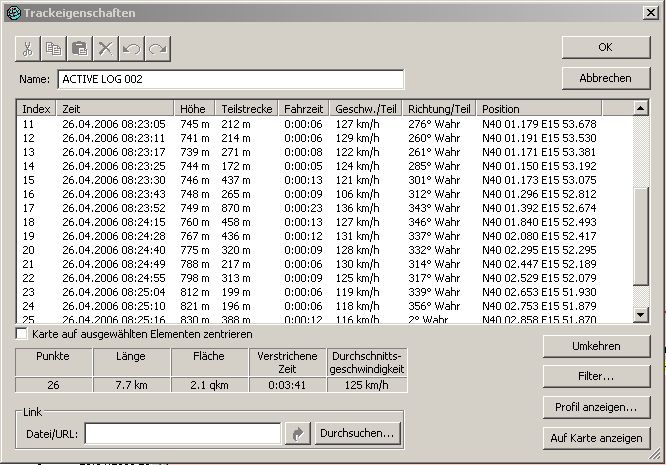 Hab in meinen logs nachgeschaut, die sind tatsächlich so wie ich sie haben möchte wub (auf einer Geraden wenig Punkt, in Kurven viel mehr). Ich habe unter Track/Aktiv/Intervall "Auflösung" und Wert "25m" gewählt. Kein Autozoom.