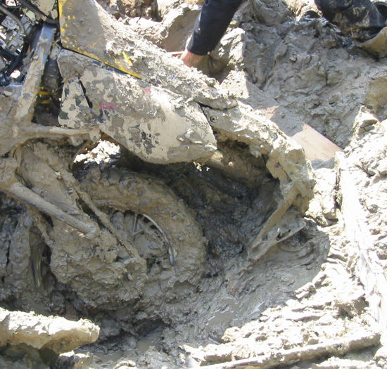 Reingefahren und das Mofa versank fast bis zum Gepäckträger im Schlamm. Gabel wer, Tank im Schlamm, Sitz hat gerade noch rausgeschaut