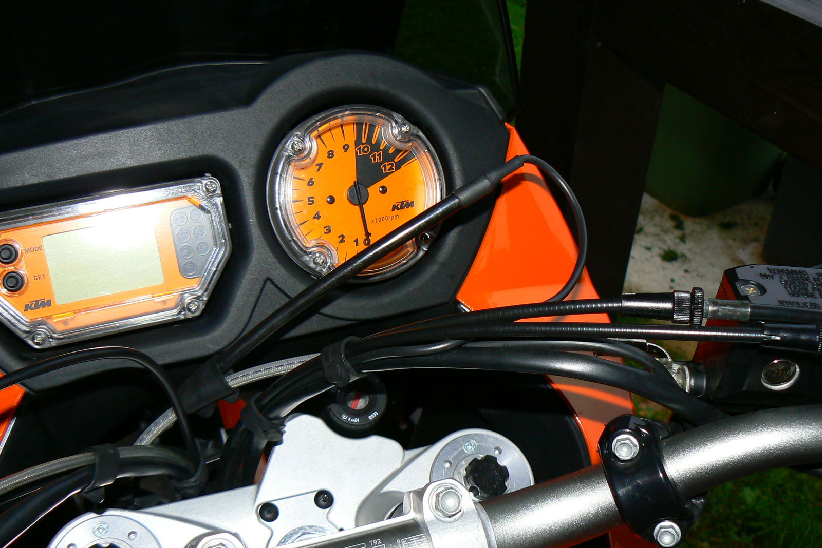 Genau so schaut das aus, Leistungsstufe II von KTM-Sommer, die Tacholeitung mit Kabelbinder an Bremsleitung tackern. Das Werkzeug ist orginal dabei, würde ich beim Verkäufer reklamieren.