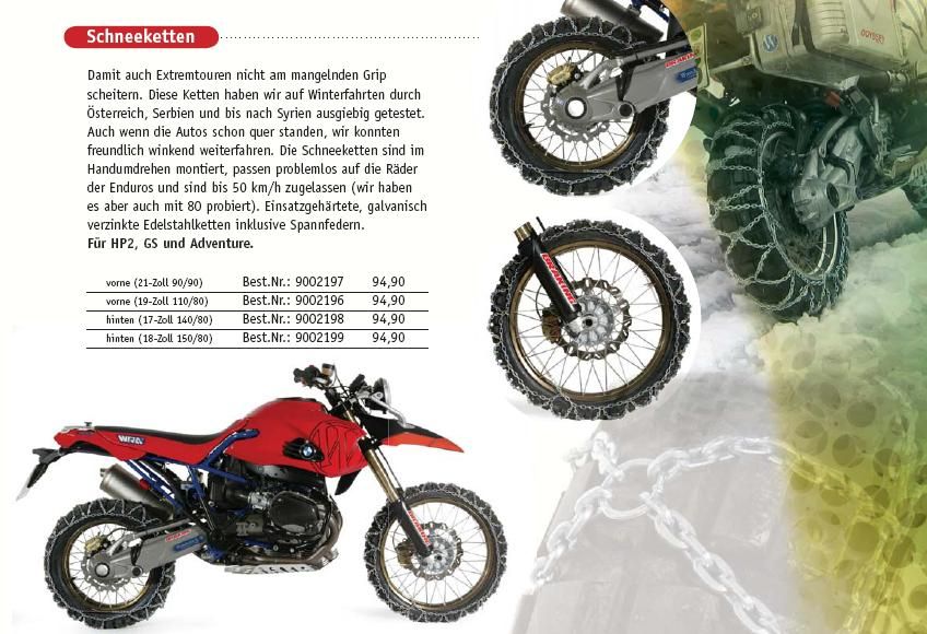 Schneeketten waren mir schon bekannt, kommen aber nicht in Frage, da ich sehr grobstollige Reifen fahre. Da ist dann immer das Problem, das die Ketten nicht sauber ziehen. Sie fällt einfach in das Negativprofil. Schneeketten bringen nur was, wenn Sie auf relativ soften Reifen gefahren werden.