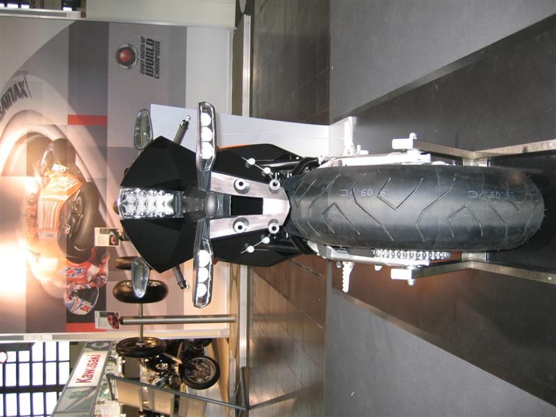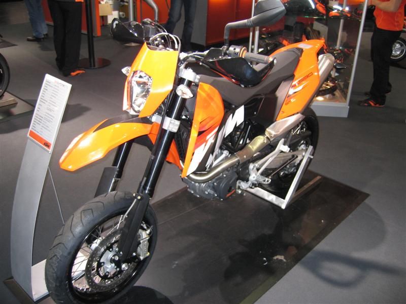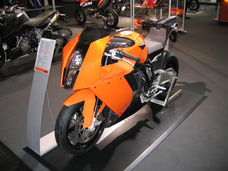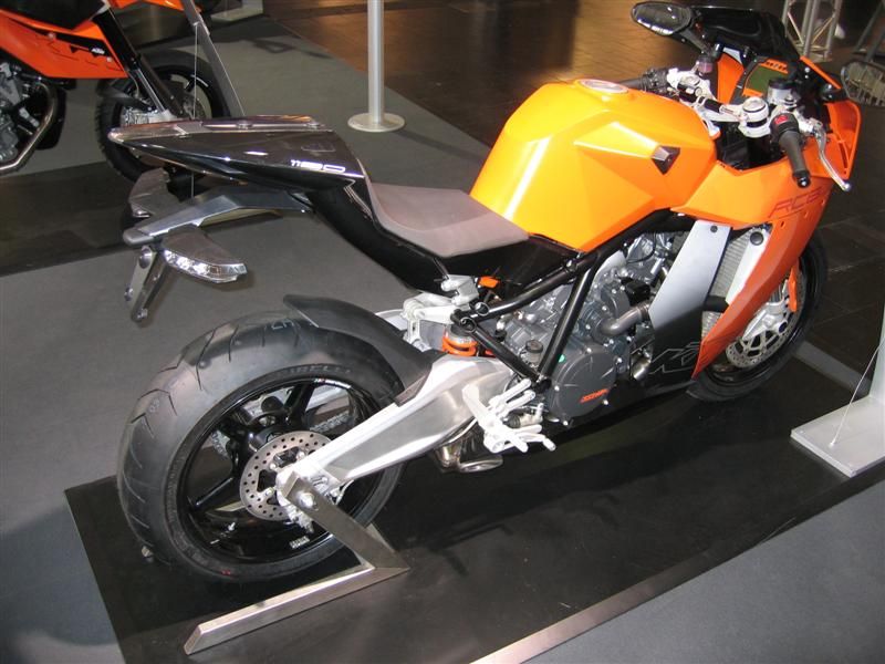 Ah,da KTM-Stand.Neue 690 Enduro,sieht in natura klasse aus.Draufhocken, paßt,super schmal kannst rutschen bis auf den Lenker,Sitzbank schmal aber gut gepolstert,aufstehen paßt auch,super Ergonomie.Neue Duke auch nicht übel,RC8 heißes Eisen, nur Tank und Heckteil wirken irgendwie billig,naja vielleicht noch Vorserie.