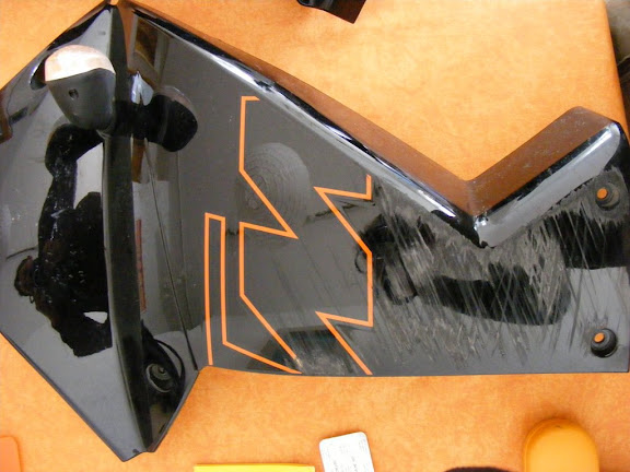 Meine Idee wäre - mit feinem Schleifpapier etwas ausgleichen (sind teilweise tiefe Riefen) und dann mit dem Pinsel vorsichtig drüberlackieren? Oder sollte ich lieber das ganze Teil (ALso die komplette Hamsterbacke) neu lackieren? Dann bliebe nur das Problem, dass mir nachher ein Teil des KTM-Schriftzuges fehlt (Das Dekor kostet als Ersatzteil 160 Euro... wacko )