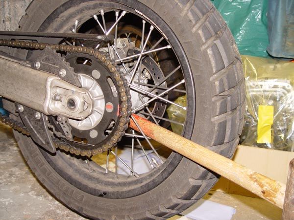 Den Schlüssel aus dem Bordwerkzeug auf die Mutter stecken, so dass er sich gegen die Schwinge abstützen kann, Motorrad möglichst schwer belasten und paarmal mit Schwung vorwärts schieben. So lässt sich die Mutter festziehen. Lösen entsprechend andersrum.