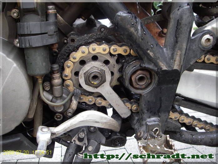Ob der Schlüssel nun unter der Schwinge ist oder darüber spielt keine Rolle. Im Vorwärtsgang (oder beim Vorwärtsschieben) kannste die Mutter nur anziehen (siehe Schradt)! Zum Lösen brauchts bei Rechtsgewinde einen Rückwärtsgang Laughing oder einen der rückwärts schiebt.