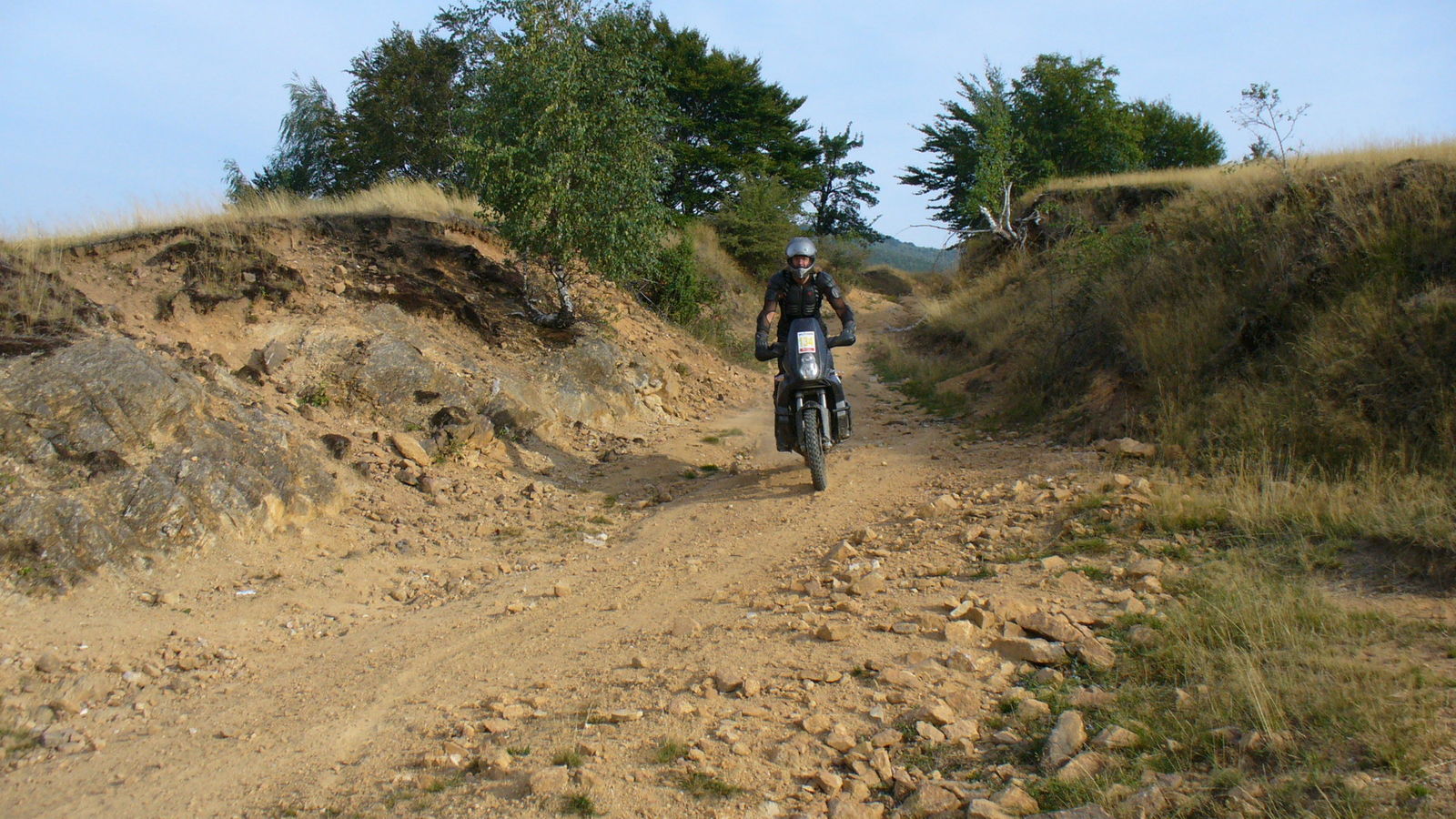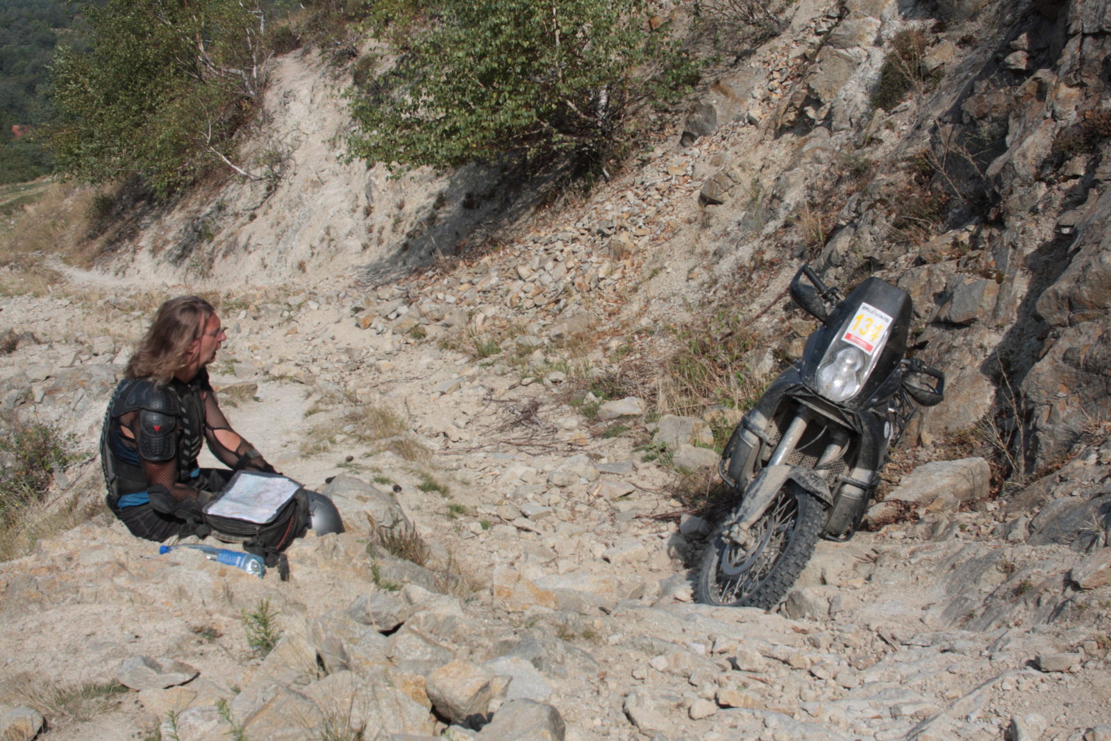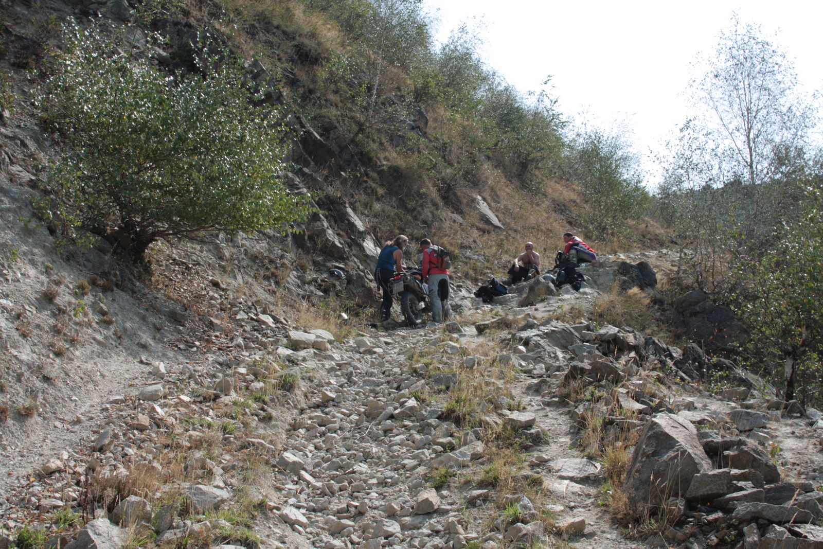 Hatte ich am Vorabend die Fahrt mit der 690 noch mit "Das ist ja wie Mountainbiken! Wo ist denn da die Herausforderung?" kommentiert, bekam ich am vierten Tag die Quittung für meinen Spruch: Eine üble Geröllauffahrt von Ilova nach IlovaTOP. Erst ein Steilhang, den wir vergeblich hinaufzufahren versuchten, bis wir den Weg fanden. Dann mehrere hundert Meter große Steine, kleine Steine und fast alle lose. Bis dahin hatte ich riesig Spaß mit der Dicken gehabt, aber ich gebe zu: Da hörte dann doch der Spaß auf für mich, und die anderen fanden's wohl auch eher störend, das Dickschiff durchschleppen zu müssen - im wahrsten Sinne des Wortes. Ehrlich, zum . Ich gebe sogar zu, als sie mir gerade mal davon gefahren waren, weil sie selbst keine Möglichkeit zum Anhalten gefunden hatten, und ich übel hängenblieb, habe ich kurzzeitig die Contenance verloren. *hüstel* Danach war erstmal Schrauben angesagt, weil mein Standgas plötzlich bei knapp 5000/min lag.