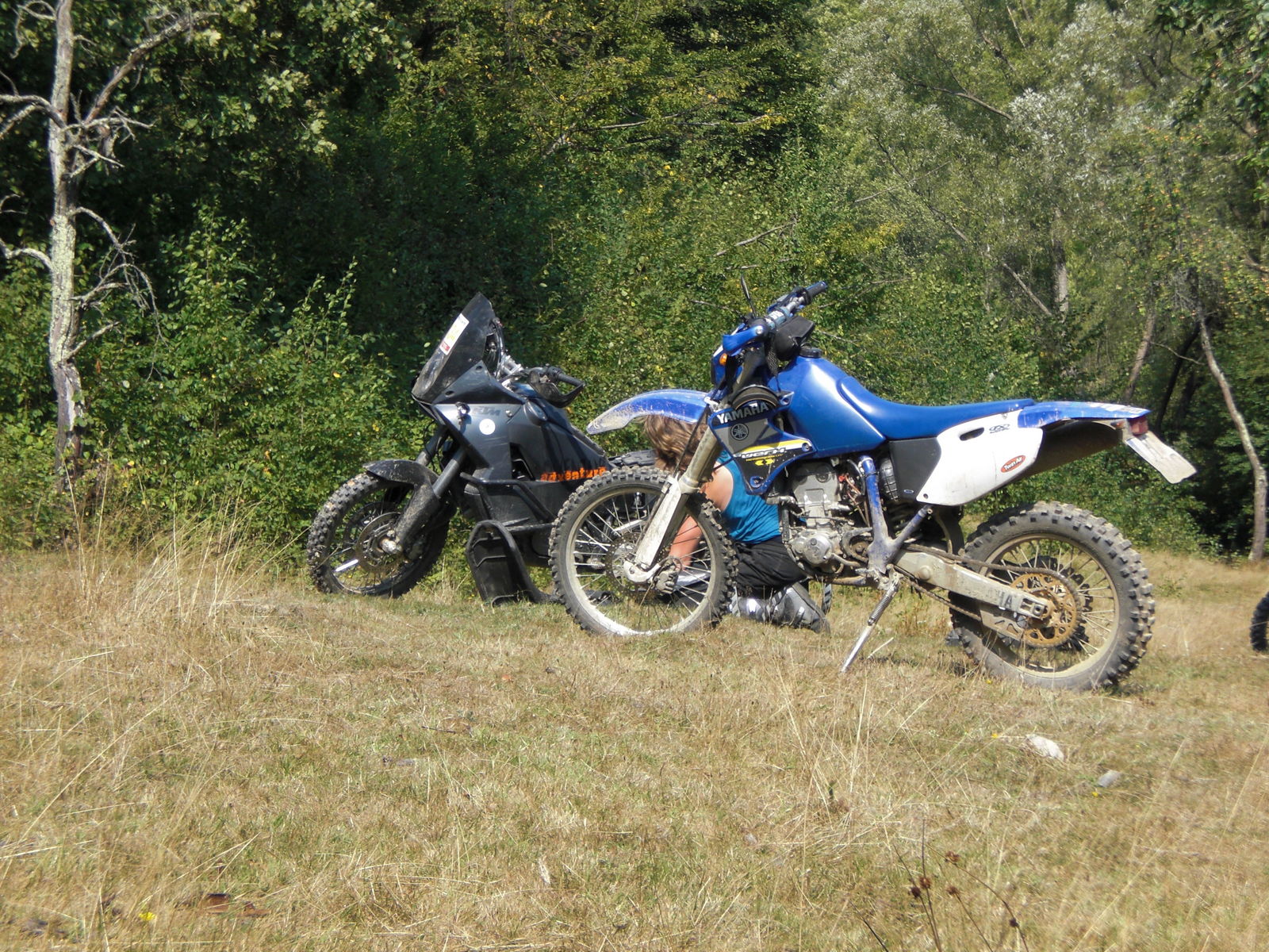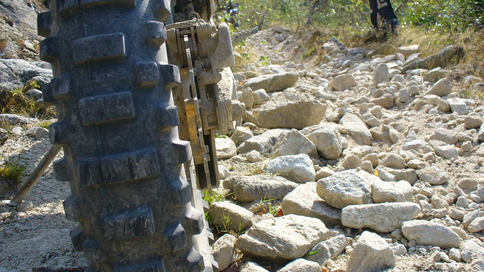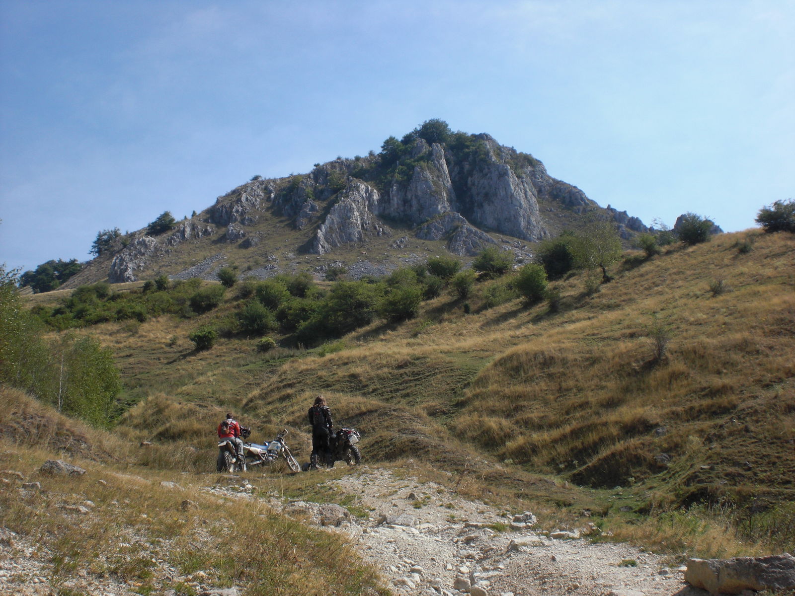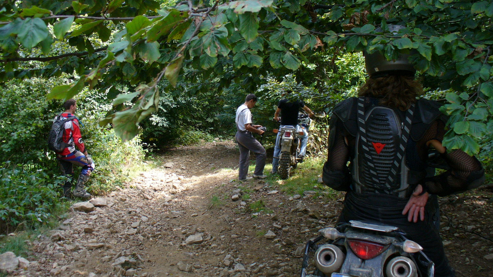 Hatte ich am Vorabend die Fahrt mit der 690 noch mit "Das ist ja wie Mountainbiken! Wo ist denn da die Herausforderung?" kommentiert, bekam ich am vierten Tag die Quittung für meinen Spruch: Eine üble Geröllauffahrt von Ilova nach IlovaTOP. Erst ein Steilhang, den wir vergeblich hinaufzufahren versuchten, bis wir den Weg fanden. Dann mehrere hundert Meter große Steine, kleine Steine und fast alle lose. Bis dahin hatte ich riesig Spaß mit der Dicken gehabt, aber ich gebe zu: Da hörte dann doch der Spaß auf für mich, und die anderen fanden's wohl auch eher störend, das Dickschiff durchschleppen zu müssen - im wahrsten Sinne des Wortes. Ehrlich, zum . Ich gebe sogar zu, als sie mir gerade mal davon gefahren waren, weil sie selbst keine Möglichkeit zum Anhalten gefunden hatten, und ich übel hängenblieb, habe ich kurzzeitig die Contenance verloren. *hüstel* Danach war erstmal Schrauben angesagt, weil mein Standgas plötzlich bei knapp 5000/min lag.