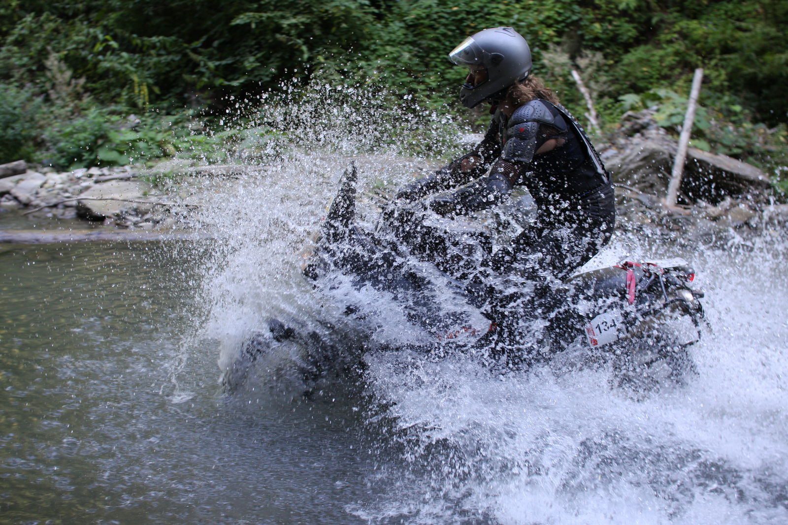 Zum Glück kommt nach kurzer Zeit eine ganze Gruppe Enduristen vorbei: Sechs starke Männer helfen mir, Kati wieder nach oben auf den Weg zu zerren. Kati springt direkt wieder an - da sag noch einer, eine KTM sei empfindlich! Mit der Gruppe fahre ich hinunter ins Tal, ich bleibe am Fall-Back-Treffpunkt und steige in den Bach, meinen etwas schmerzenden Daumen kühlen.
