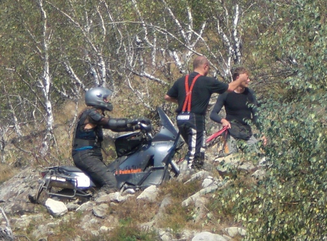 Lageanalyse: Ich habe ein Motorrad im Steilhang, das Vorderrad zeigt nach unten und rutscht langsam vom Baum ab. Eeep! Bin selbst aber unverletzt und Kati sieht auch noch gut aus. Was tun? Gang rein, Kati umwerfen, damit sie liegenbleibt. Rausklettern, Helm ab, Jacke aus, gut sichtbar hinlegen. Und nun? Keine Chance, sie alleine herauszuzerren, und meine Jungs wissen nicht, wo ich bin. War da nicht was mit niemals alleine Enduro fahren? Jetzt bleibt nur: Warten.
