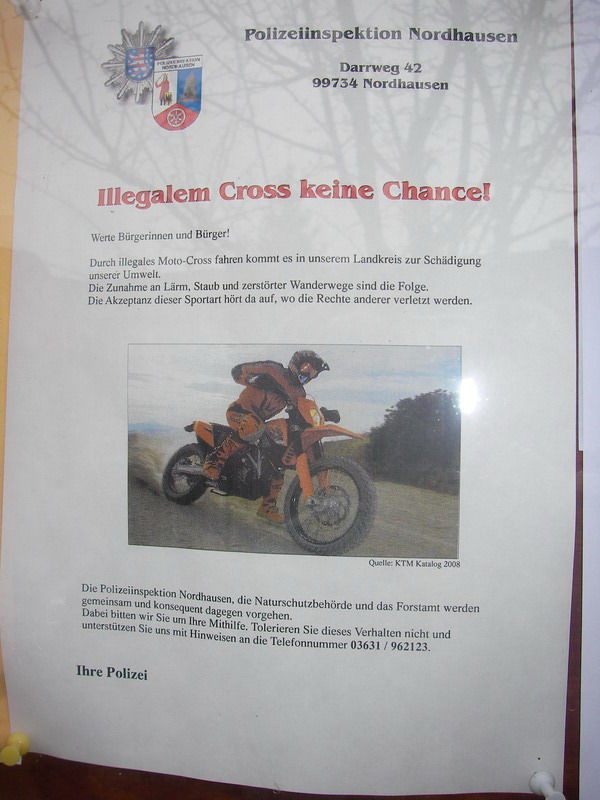 Na... eine bessere und billigere Werbung kann ja KTM in Nordhausen kaum bekommen. Laughing Meistens sind die von der grünen Minna nicht das Problem. Im 'Gegenteil die das nur an, wen sie einen Auftrag ausführen mussen, wo sie kaum Erfolge haben. Das Problem sind viel mehr die Förster und Pächter. Die sich manchmal mit Aktionen behelfen, die über Paraphen hinaus schiesen und sich damit selbst strafbar machen. Die fühlen sich persönlich angegiffen, da ist Ihnen fast jedes Mittel recht. Ist ja auch "Ihr Wald".