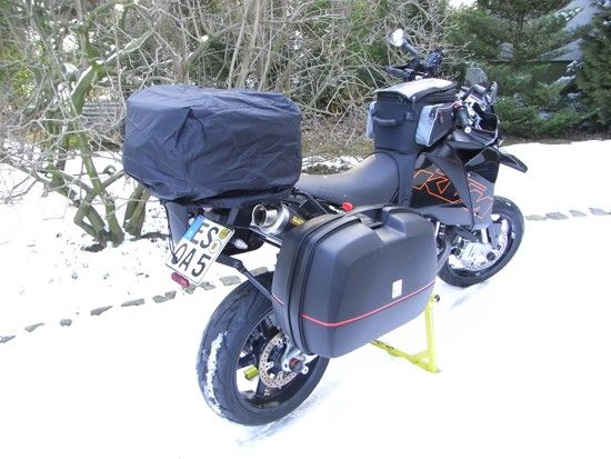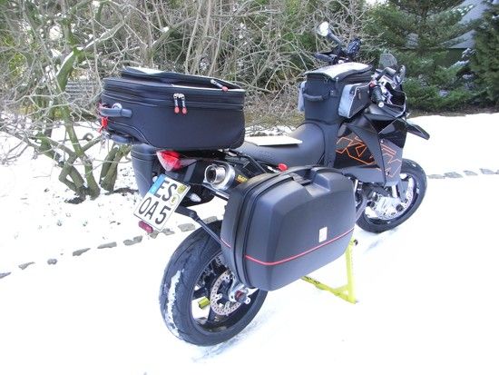 Die Seitentaschen von KTM sollen zwar den Stauraum von 13 Litern besitzen, aber dieser Raum ist schlecht auszunutzen. Weiterhin finde ich die 'Sicherungsmöglichkeit der KTM Taschen eher ... mäßig. Die org. Taschen sind vom Design sicherlich die schönsten, aber vom Stauraum her passen hier höchsten ein paar Socken und Unterwäsche rein. Ein Paar Schuhe wäre schon nicht mehr möglich.
