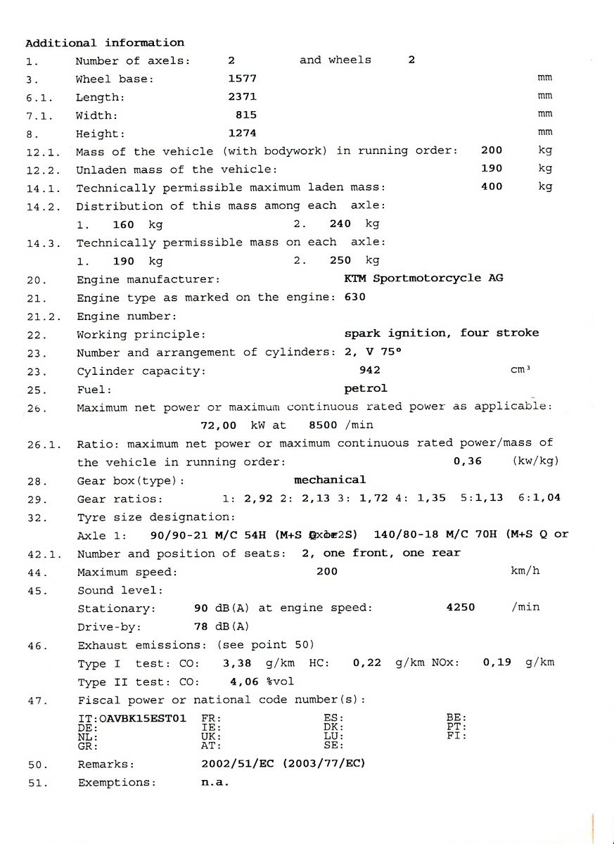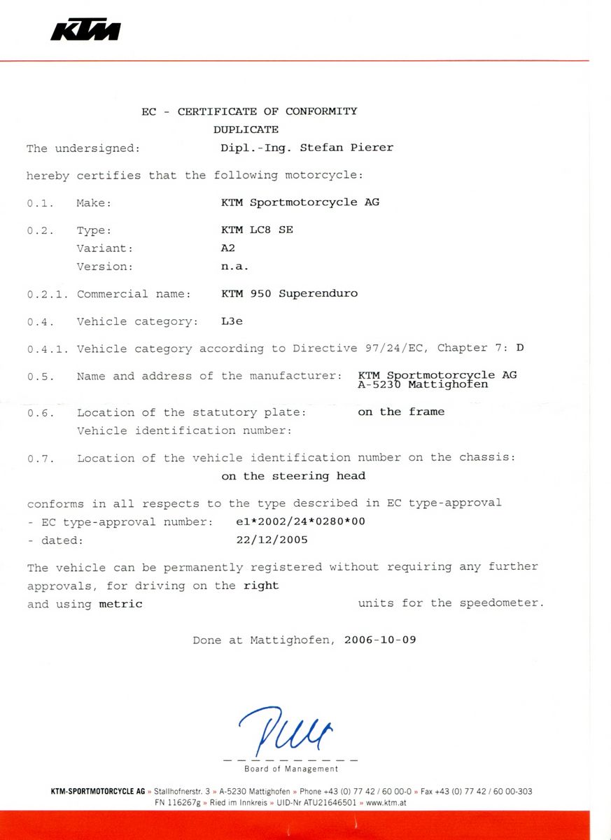 Und damit wir mal vom Gleichen reden, habe ich grad mal die COC Papiere meiner 2006er SE gescannt und poste die hier mal rein. Was bei 32 steht ist "komisch" zu lesen, es ist aber exakt so im Okkinal!