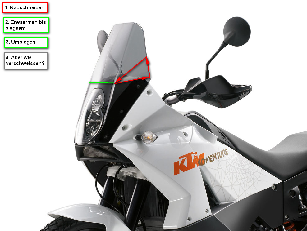 -Die Scheibe ist aus Makalon, steht zumindesten drauf. Makalon kann lt. Auskunft eines Verkleidungsdoktors (der nennt sich wirklich so) nicht geschweißt werden. Vom kleben rät er ab wg. der Vibrationen und des Winddrucks werden sich fast zwangsläufig Risse bilden.