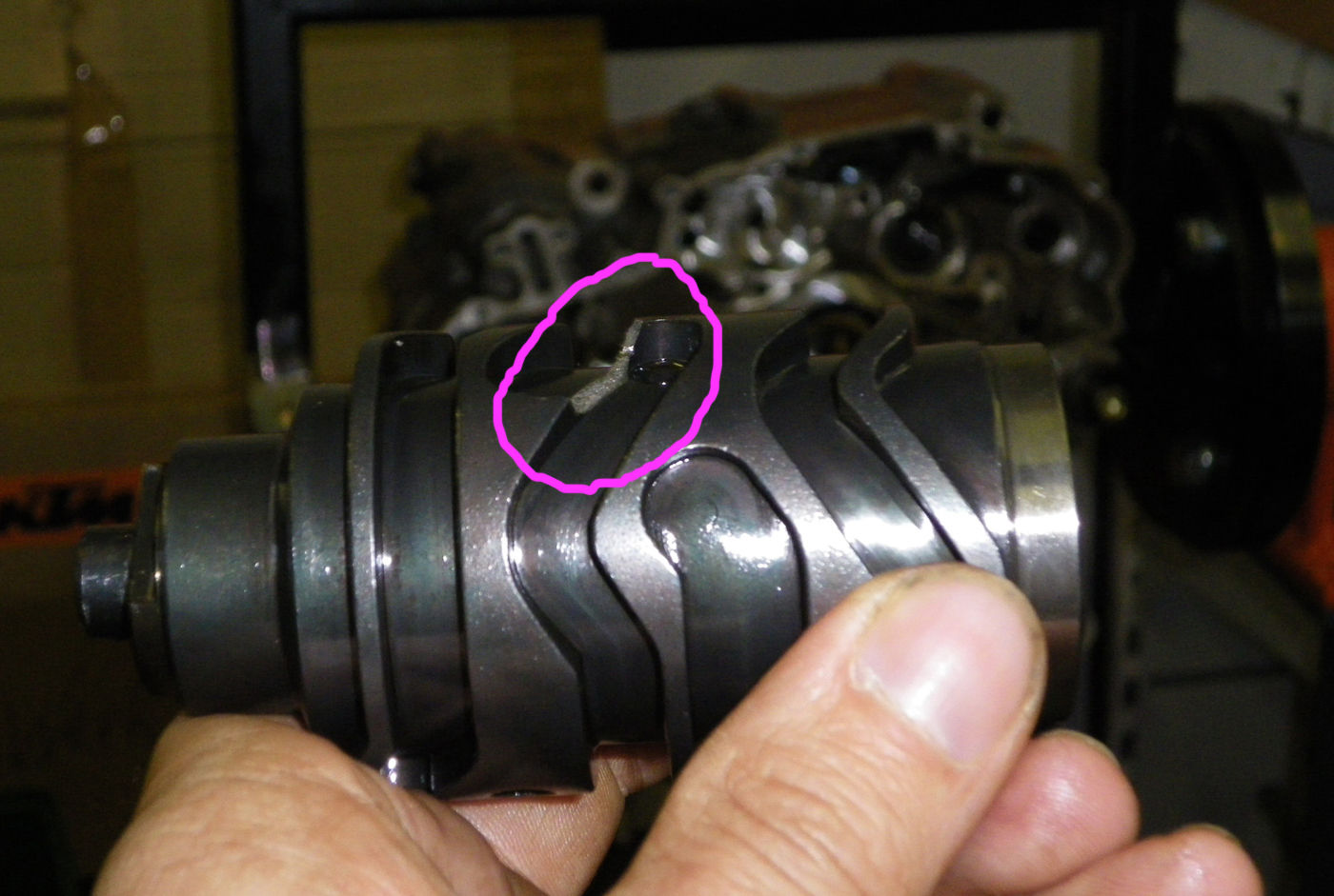 Nun ist es herausgefunden, es ist tatsächlich die Schaltwalze defekt, es ist ein Stück von einem Steg an einer ziemlich schmalen Stelle herausgebrochen. Natürlich mußte der Motor völlig zerlegt werden, aber die gute Nachricht ist, daß alles vom Innenleben noch im absolut grünen Bereich ist, lediglich ein paar Kupplungsscheiben sind nicht mehr viel wert und eine Stahlscheibe ist etwas eingelaufen(hatte in letzter Zeit im kalten Zustand etwas Kupplungsrupfen, kann das was damit zu tun haben? Question )