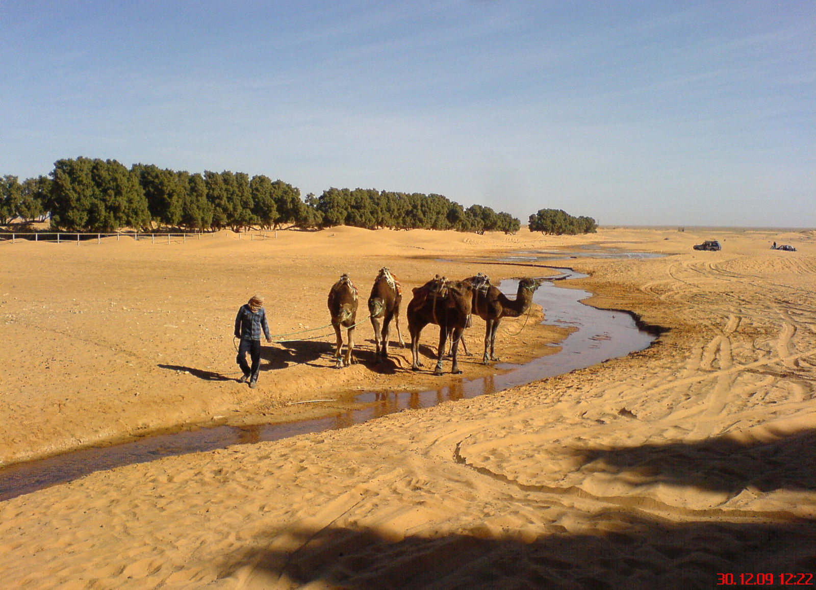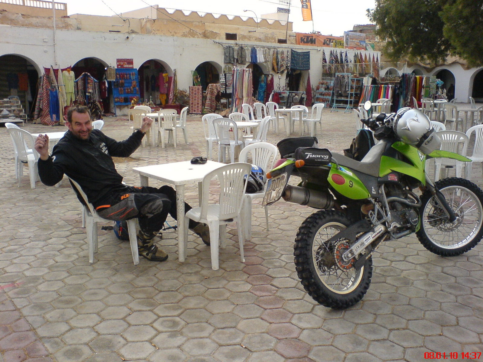 Mein Zelt auf- und abbauen klappt gut, Wir erreichen Ghilane, eine ziemlich große Oase, gegen Mittag und gehen in dem berühmten See baden, ziemlich viel los vor dem Jahreswechsel, und essen was. Der Freddy hat aber nich vor hier zu campieren, er will Silvester am Tembaine sein. So brechen wir etwas hektisch auf, ich schnappe noch schnell Koordinaten und Cafe Bebane auf, ein Wüstencafe, was auch immer das is. Jetzt kommen gleich heftige Dünen, der Sand trägt am Nachmittag gar nich mehr. Von Piste nichts zu sehen. Die zwei besten Motorradfahrer fahren vor, ich bin hinter den LKWs, die fahren einen komplett anderen Rhythmus, hinterherfahren geht gar nicht, ohne die Kupplung zu ruinieren. Einfach überholen und denen im Weg rumfahren geht auch nicht, also versuche ich 2-3 Dünen entfernt, rechts vorbei zukommen. Das geht schief, ich grabe mich an einer ganz ungünstigen Stelle ein, brauche eine Viertelstunde bis ich wieder vorwärts komme, jetzt ist keiner mehr in Sichtweite. Ich versuche die Route zu schneiden und schnell zu dem Motorradfahrern aufzuschliessen. Ich erreiche sie aber nicht, und beschließe, nun wieder auf die LKWs zu warten, die haben aber inzwischen eine andere Route eingeschlagen und sind nochmal zum alten Fort hochgefahren. Ich begreife langsam, dass ich jetzt alleine in der Wüste stehe. Meine Panikattake unterdrücke ich mit dem rationalen Gedanken, dass ich ja grad getankt und die Wasserblase aufgefüllt habe. Ich rauche hektisch und überlege: zurück nach Ghilane, wo die Anderen ja definitiv nicht sind oder allein weiter zu diesem Cafe. Arabische Jeeps kommen vorbei und erkundigen sich, ob alles in Ordnung ist, ich weiß nicht so richtig was ich sagen soll. Ich fahre zu dem Wegpunkt, den ich habe, per Luftlinie, die Strecke geht jetzt halbwegs, teilweise ist Piste erkennbar und jetzt kommts dick, der Punkt ist mitten in der Pampa, nix Cafe, nix die Anderen. Kein Netz. Ich warte an dem Punkt, mir wirds jetzt anders, nicht mehr lange bis zum Sonnenuntergang. Es halten mal wieder welche, ich frage,wo hier das nächste Cafe ist, 25 km Richtung Douz ist die Antwort, hm prima. Ich forste mein Oregon durch und entdecke ein Bierkrugsymbol auf der Tunesienkarte, nicht weit. Jetzt kommt eine Gruppe schweizer Enduristen in der richtigen Richtung, ich entschließe mich, bei denen mitzufahren, schaffe es aber nicht, weil die Karre wieder etwas muckert (übrigens das letzte mal, ab da lief sie ohne einen Aussetzer) Jedenfalls komme ich zu einer Strohhütte mit Bettenlager, die Schweizer fahren weiter. Ich entdecke ein Schild Cafe Grand Erg. Hm ich denke, gerettet, aber falsch hier. Der Besitzer, ein netter Araber, bemerkt meine Sorge und gibt mir erstmal einen Tee. Nach einigem Gespräch bekomme ich heraus, dass dies das Cafe Bebane ist, auf arabisch. Der muß denken, dass ich nich ganz dicht bin, weil ich mir das noch mind. 15 x bestätigen lasse. Es dauert etwas, da kommen unsere 2 Motorradfahrer und später der ganze Troß. Ein Stein fällt vom Herzen. Ich erfahre später, dass die Koordinaten aus dem GoogleEarth stammten und somit eine Abweichung in sich trugen, anderes System. Der Schock sass. Nachtlagerunweit vom Cafe.