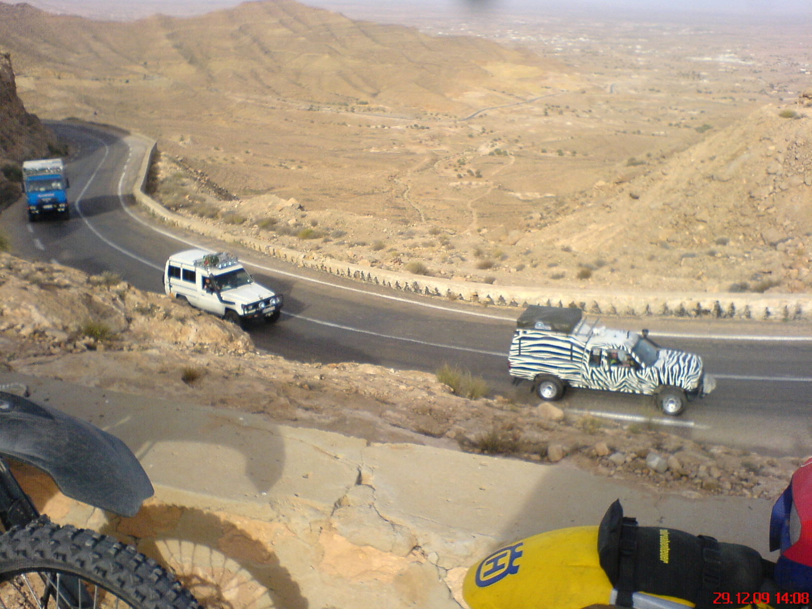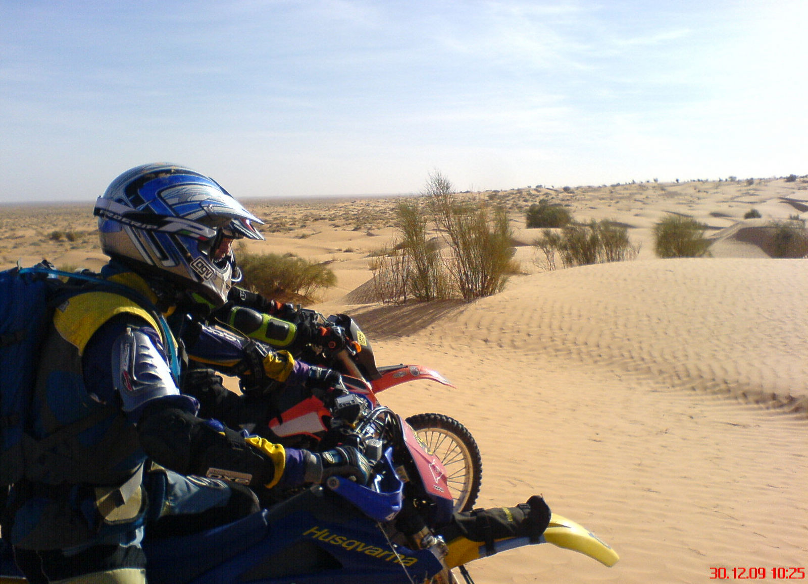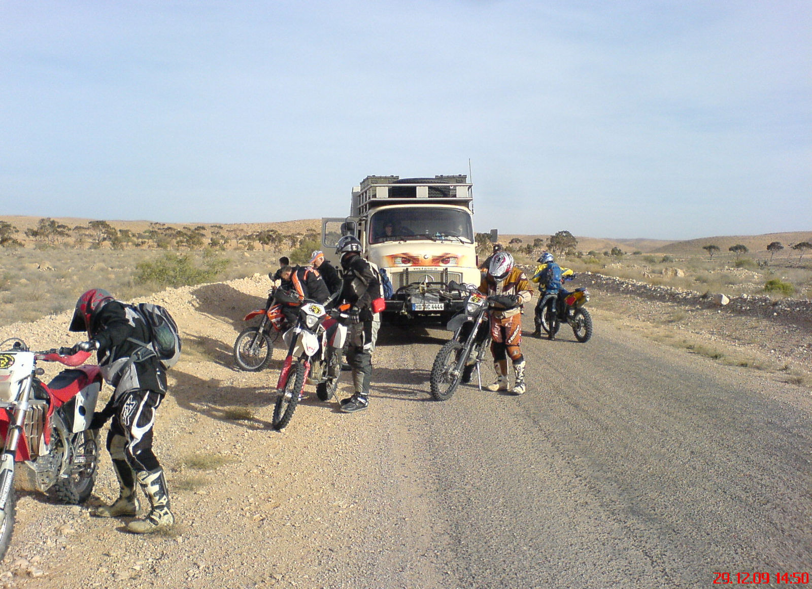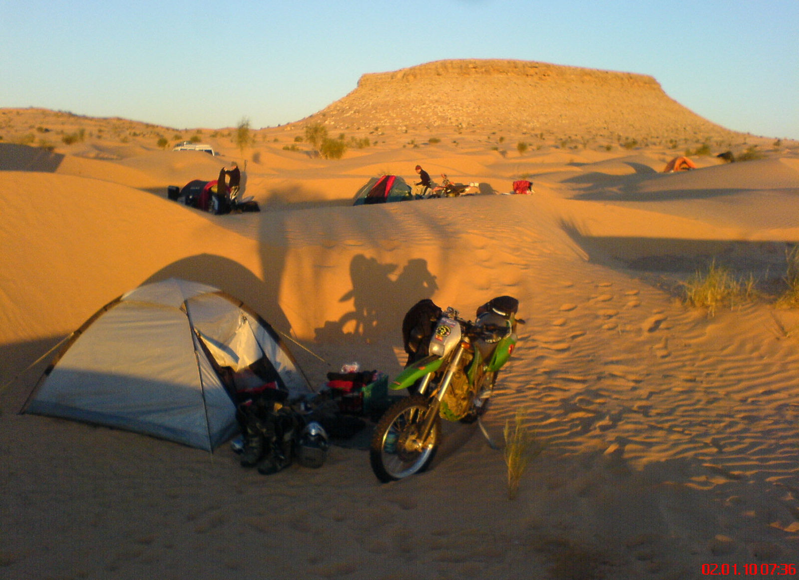 die Motorradfahrer verlassen die Strasse, nun Piste und freies Gelände, gleich ziemlich hart und es wird ganz schön schnell gefahren, viel große spitze Steine und häufig versteckte Löcher. Es geht richtig zur Sache. Die ersten scheitern an einem Plateau mit zu hohen Absätzen. Habe Respekt vor den gewaltigen Landschaften bekommen. Es bilden sich Fahrgemeinschaften von gleichstarken Fahrern heraus und es wird versucht sich bezüglich unterschiedlicher Ansprüche / Routenwahl abzusprechen und abzustimmen. Der erste Platten wird gemeinsam geflickt. Heftiges Sportendurogelände und meine erste Feinsanddüne, komme fast bis hoch, und weiß ab jetzt, was graben bedeutet, da kommen später aber noch ganz andere. Hier muß man schön mit seinen Kräften haushalten. Wir erreichen Bir Sultane und machen Nachtlager im Freien. Das Motorrad wurde heftigst gefordert, ich kann mithalten, liege irgendwo im Mittelfeld, aber mit einer 50 kg schwereren Kiste ists schon sehr anstengend und der Mikuni fing nach ganz heftigem Geschüttel mal kurz an zu stottern, oh weh, hoffentlich wirds nicht schlimmer.