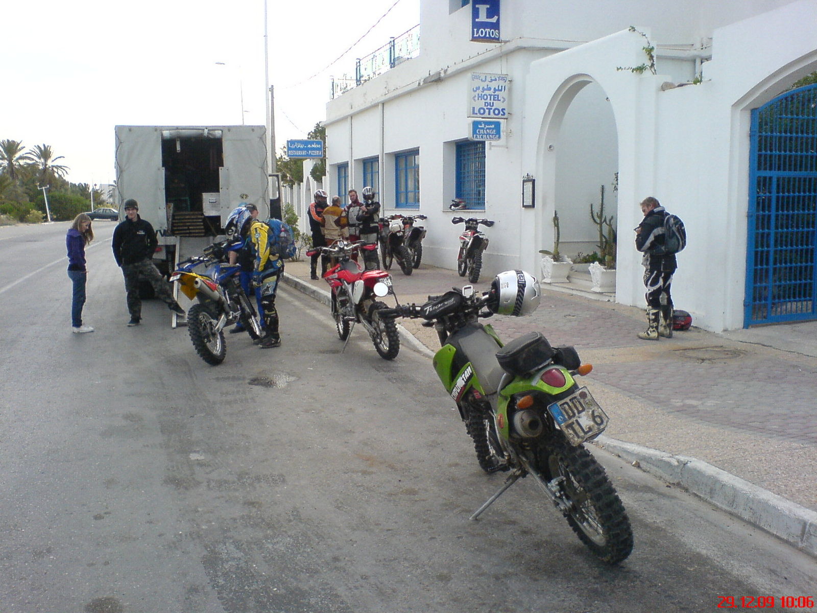 Von Frankfurt gings weiter nach Djerba, ins warme Tunesien. Zollkontrollen, trotz Flachmann mit Motorenöl im Gepäck, passiert. Alles stand bereit. Kurzer Kennenlernabend im Hotel Lotos und sich selber und Ausrüstung sortieren war angesagt.