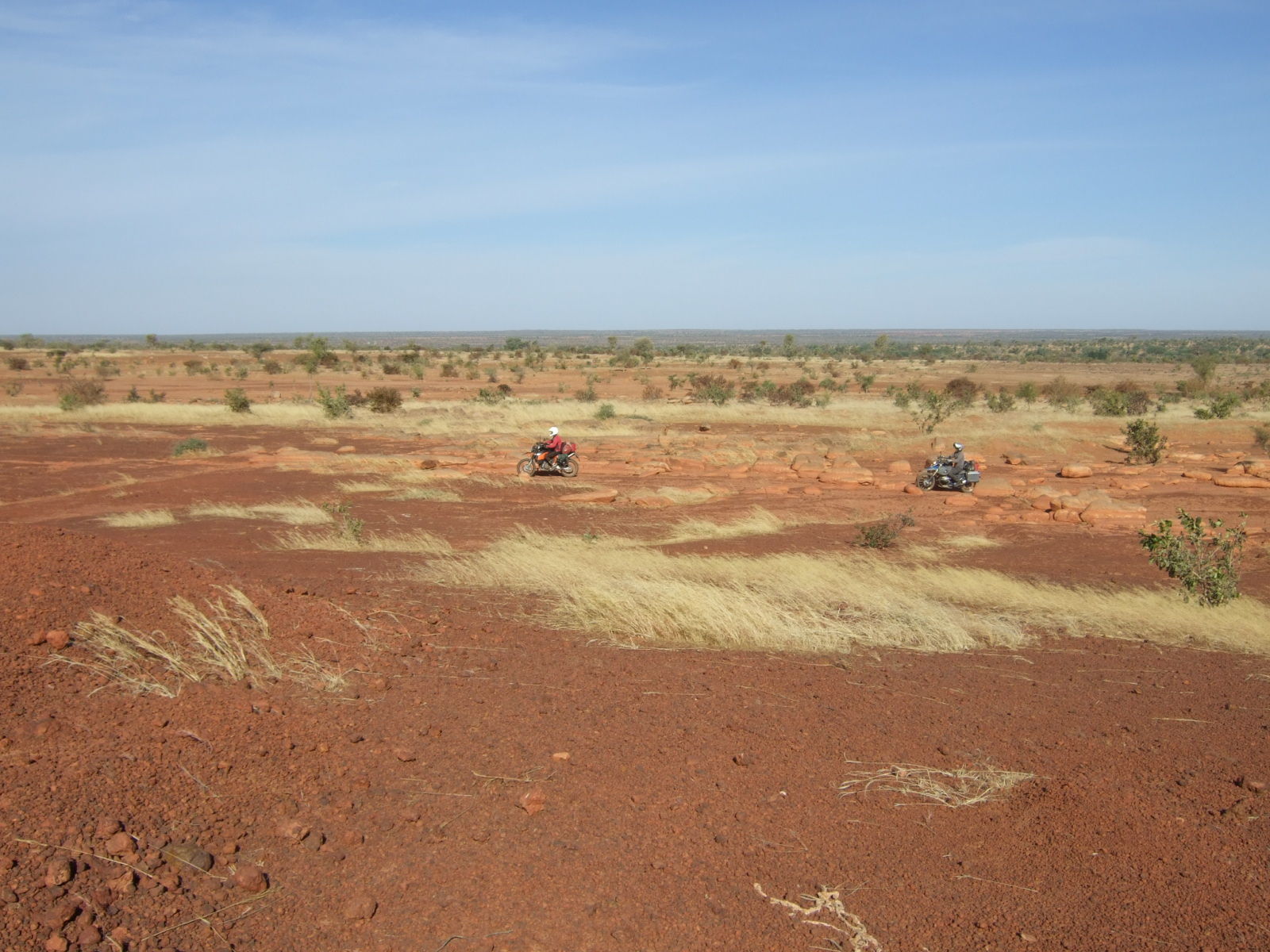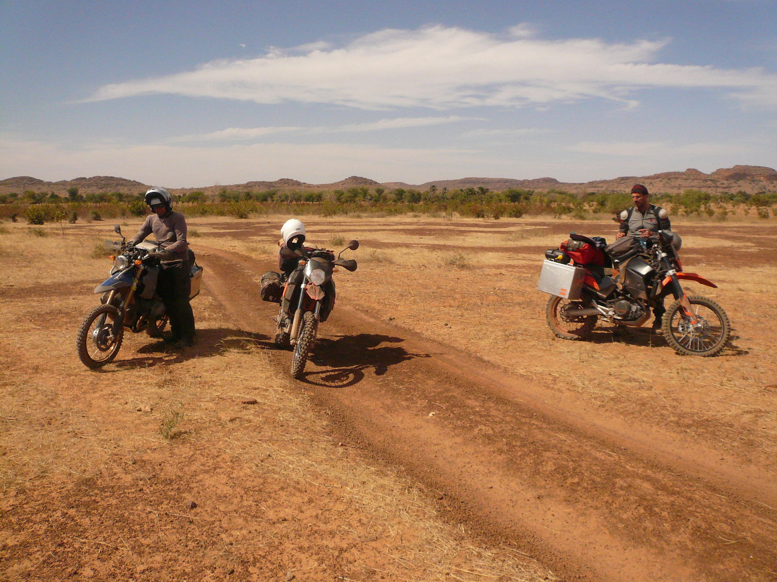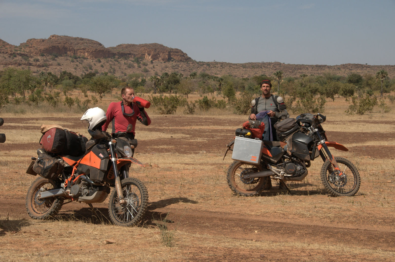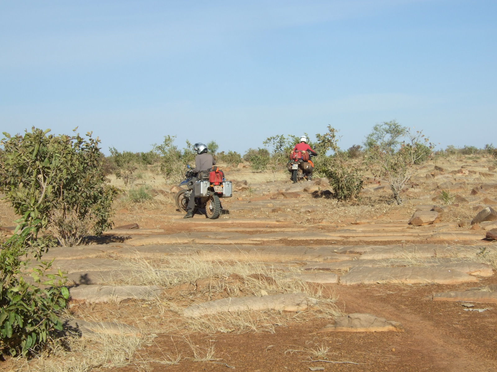 Im Vergleich zu einer Saharafahrt, ist Westafrika fahrtechnisch nicht so anspruchvoll aber immer noch sehr reizvoll und wir hatten auch eine Menge Spaß mit unseren Maschinen. Vom verblockten steinigen Gelände, zu verspurten sandigen Passagen bis hin zur Hochgeschwindigskeitpiste auf der man auch mal 120km/Std. dahin rauschen konnte, war alles dabei. Maximale Aufladung war für 3 Tage Verpflegung ausgelegt mit ca. 15 Liter Trinkwasser, 40L Sprit, Essen, Zelt, usw. Bei Temperaturen bis zu 40 Grad wird das Fahren dann auch schon mal zur Qual und man ist froh abends ein kühles Bierchen zu zischen oder wenn Buschcamping angesagt war, Wasser das auf etwa Körpertemperatur erwärmt war zu schlucken - so bekommt man wenigstens keine Halsschmerzen