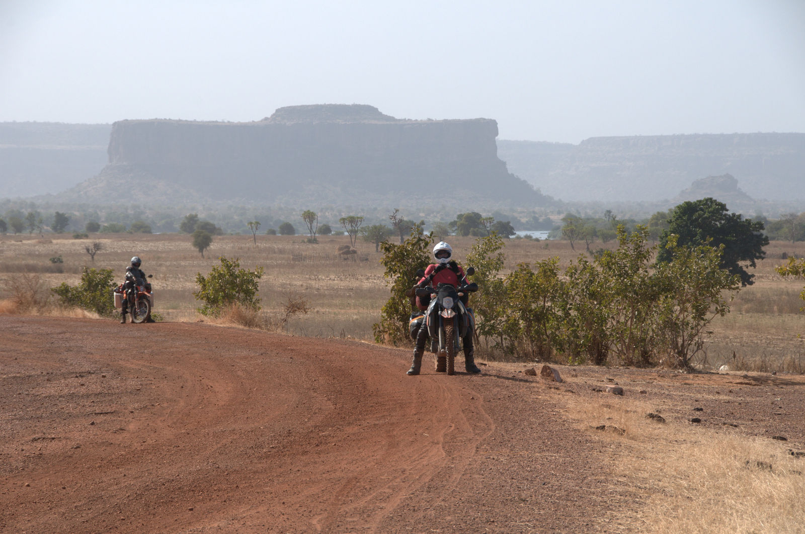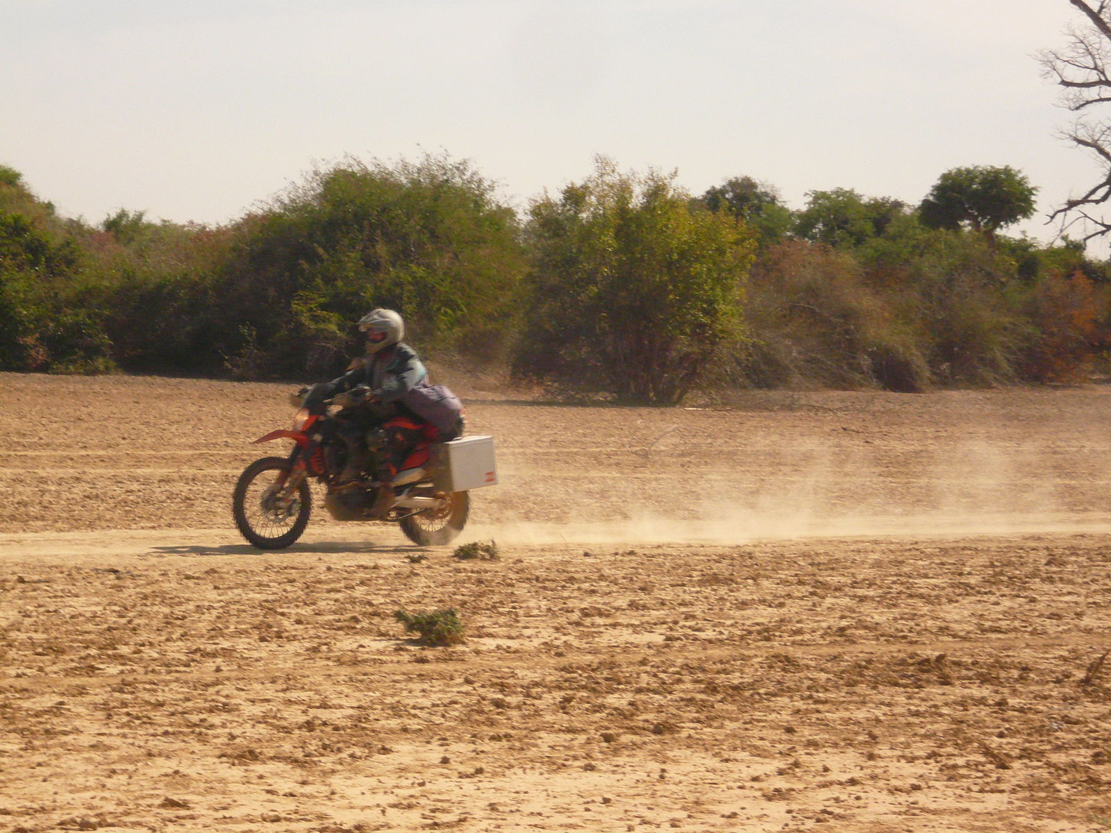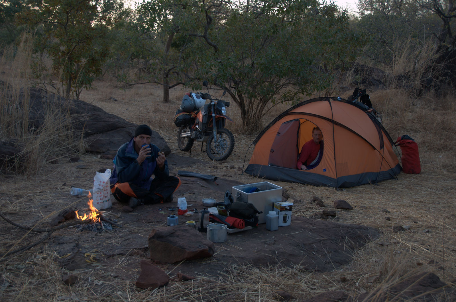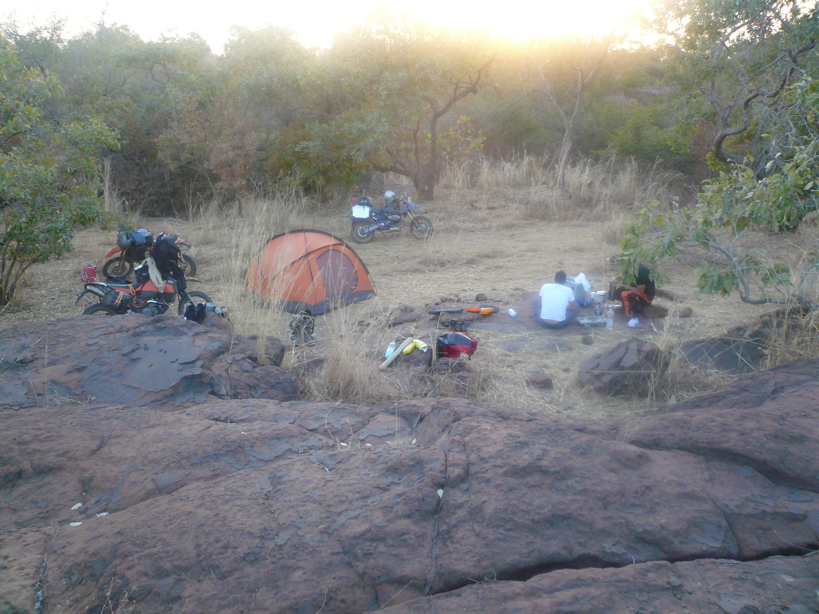 Im Vergleich zu einer Saharafahrt, ist Westafrika fahrtechnisch nicht so anspruchvoll aber immer noch sehr reizvoll und wir hatten auch eine Menge Spaß mit unseren Maschinen. Vom verblockten steinigen Gelände, zu verspurten sandigen Passagen bis hin zur Hochgeschwindigskeitpiste auf der man auch mal 120km/Std. dahin rauschen konnte, war alles dabei. Maximale Aufladung war für 3 Tage Verpflegung ausgelegt mit ca. 15 Liter Trinkwasser, 40L Sprit, Essen, Zelt, usw. Bei Temperaturen bis zu 40 Grad wird das Fahren dann auch schon mal zur Qual und man ist froh abends ein kühles Bierchen zu zischen oder wenn Buschcamping angesagt war, Wasser das auf etwa Körpertemperatur erwärmt war zu schlucken - so bekommt man wenigstens keine Halsschmerzen