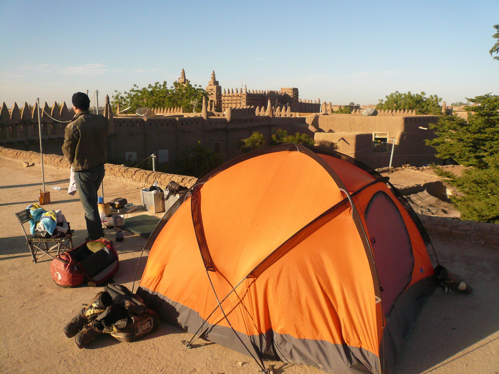 Camping über den Dächern von Dejenne mit der Moschee im Hintergund