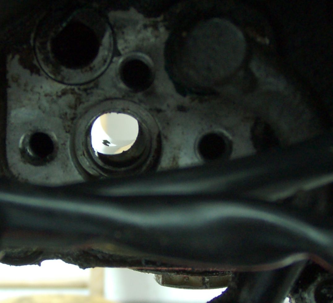 Vom Oeltankventil fuehrt eine Oelleitung in den Motor, wo dann das Oel irgendwie auf die andere Seite des Motors in die Druckpumpe gelangt. Die Oelleitung wird mit einem Blech im Motor gehalten und mit 2 O-Ringen drin abgedichtet. Und dann geht es irgendwie weiter. Ich weiss nicht, ob da einfach eine Bohrung durch beide Motorhaelften geht, oder ob im Motor noch ein Rohr/Huelse oder sowas verbaut ist. Auf jeden Fall sieht das bei mir so aus, als wenn da die Haelften nicht genau aufeinander treffen, oder das Rohr/Huelse nicht genau das Loch zur Oelleitung trifft. Von der linken Seite aus reingeschaut, sieht man unten rechts eine Kante von ca. 2 mm, von der anderen Seite geschaut, eine Kante oben links. Das pic ist leider sehr unscharf. Die beiden ersten Verengungen sind ok, zur Abdichtung, aber ganz leicht kann man noch die Kante unten rechts sehen. Kann ja eigentlich nicht sein, dass die Leitungen so stroemungsunguenstig aufeinander treffen.