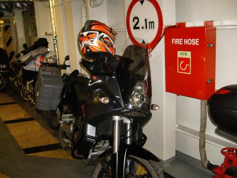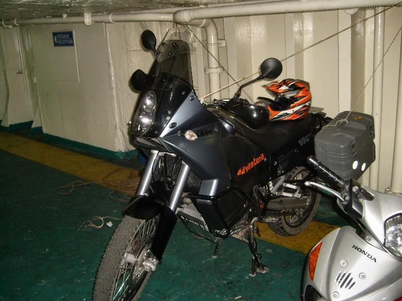 Wenn die Möglichkeit besteht, das Mopped immer mit dem Seitenständer zur Schiffswand stellen. Zwischen Koffer und Wand den Rückenprotektor einklemmen, oder ersatzweise ein festes Stück Pappe etc. SEILE SELBER MITNEHMEN....iss nicht gesagt das in der Garage welche zu finden sind. SELBER DAFÜR SORGEN DAS MOPPED GUT VERZURRT IST.....NICHT AUF DAS PERSONAL VERLASSEN!!!!!!! UND WENN: daneben stehen bleiben und zusehen. Die binden die Seile an Seilzüge und sonst wohin (oft!), die übelsten Sachen schon gesehen, wobei das Personal noch um einiges besser ist von ITA nach GR als innergriechisch...da isses ne Katastrophe.