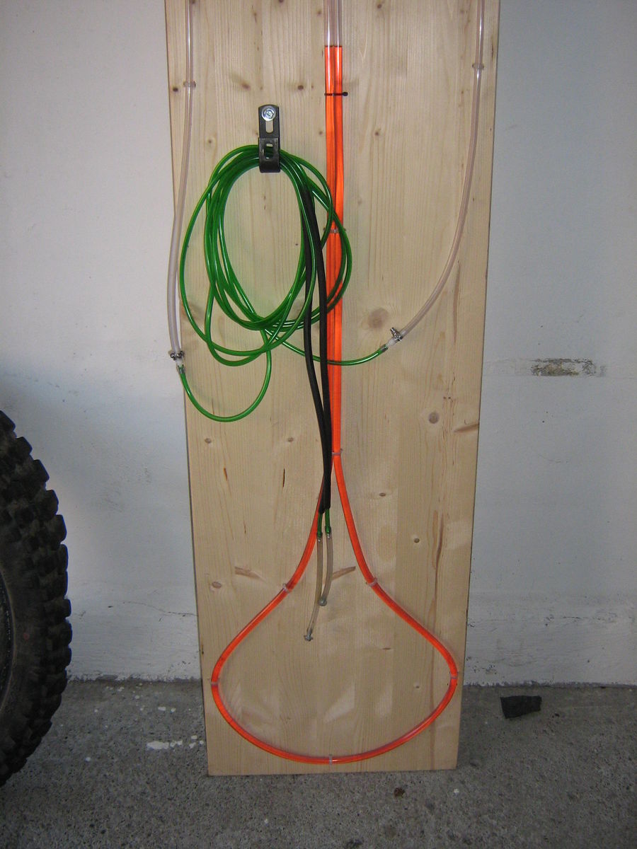 Danach den 6mm Schlauch an Außenseiten des Bretts nach unten führen(ca. bis zur Höhe des Öl's) und mit Kabelbindern am Brett befestigen.