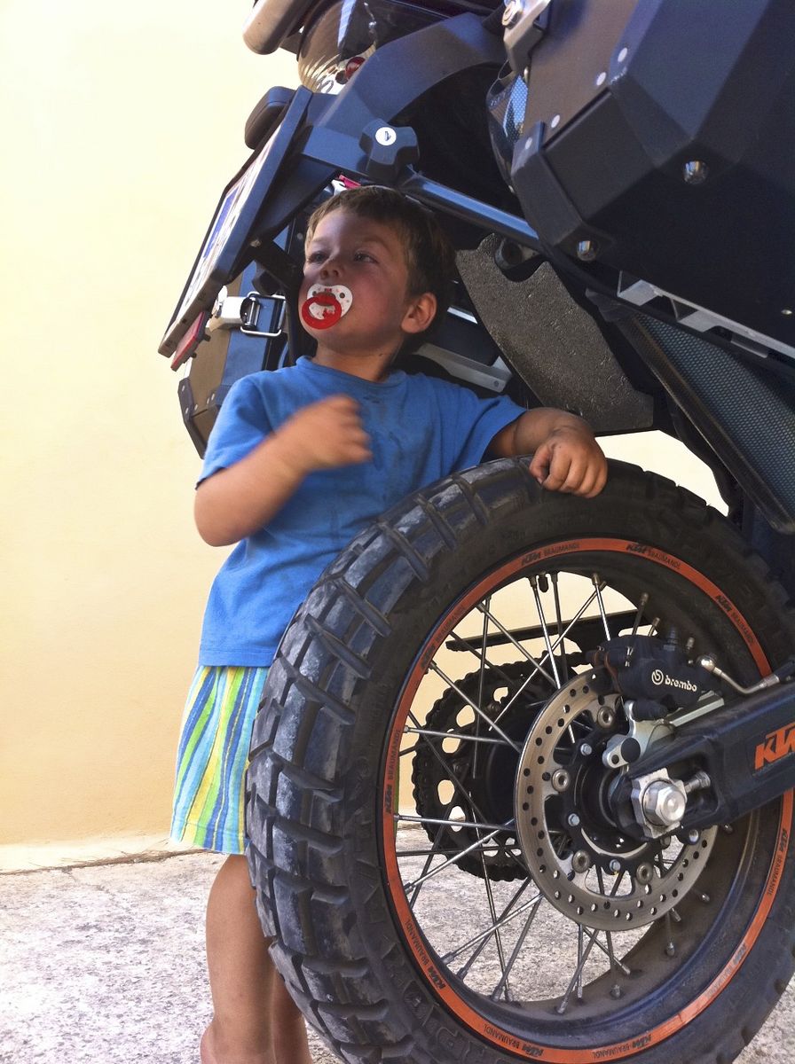 kurz nach nardo (noch 18km bis zum campingplatz "baia di gallipoli") hat sich mein hinterreifen geplättet. super! ...und das kurz nach 2200 uhr... begeisterung macht sich breit. da biegte ne vespa schräg gegenüber in eine einfahrt ein - ich schieb die kleine quer rüber und versuche dem fahrer mein problem zu erklären und der nickt auch verständnisvoll und quatscht mich auf italienisch nieder. meine frage nach deutsch bzw. englisch quitiert er mit einem schulterzucken und verschwindet. während ich den hoffnungslosen versuch starte die @ auf den ständer zu bringen, taucht er mit seinem nachbarn auf, der recht gut deutsch spricht und mir gestattet das motorrad hinter seinem haus zu parken. natürlich kam sofort die ganze familie aus dem haus um mich zu begrüßen und das problem zu begutachten.