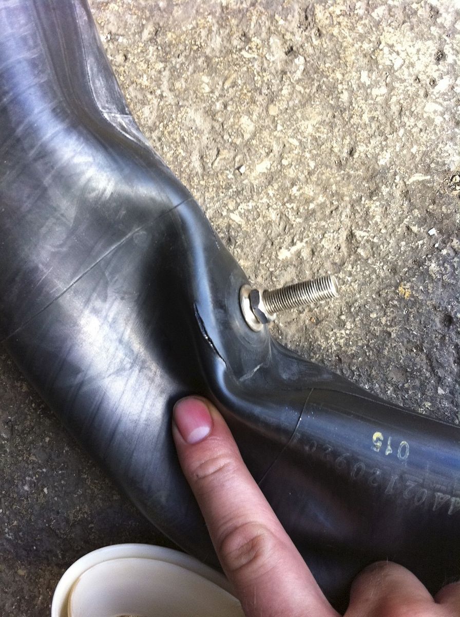 am nächsten tag, sonntag, hinterrad ausgebaut und beim reifenschuster den schlauch wechseln lassen (ersatzschlauch war mit im gepäck). dabei wurde der schaden begutachtet - riss neben dem ventil...