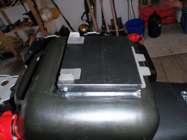 Fürs 1. hab ich mir 2 Kunststoffreservekanister aus PEHD besorgt je 10l, dann habe ich mir aus 2 Edelstahlplatten 1,5mm eine Grundplatte mit 4 Laschen schneiden lassen, diese entsprechend abgewinkelt und auf die PEHD Tanks mit Kunststoffplatten aufgeschweißt.