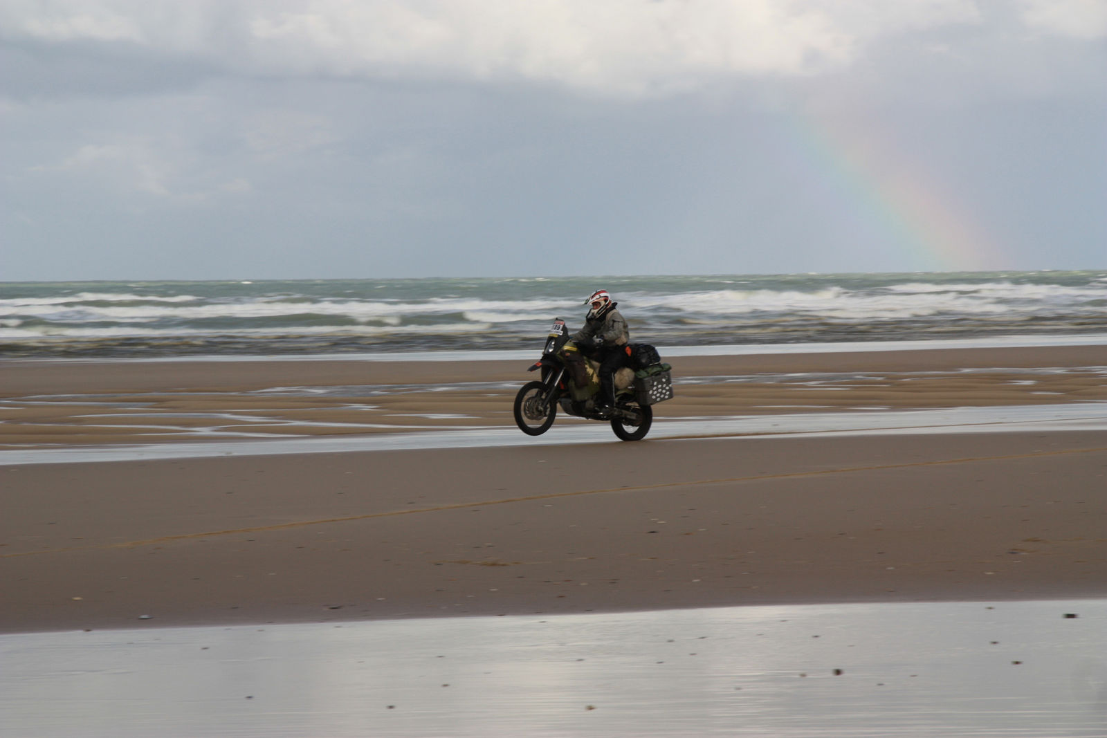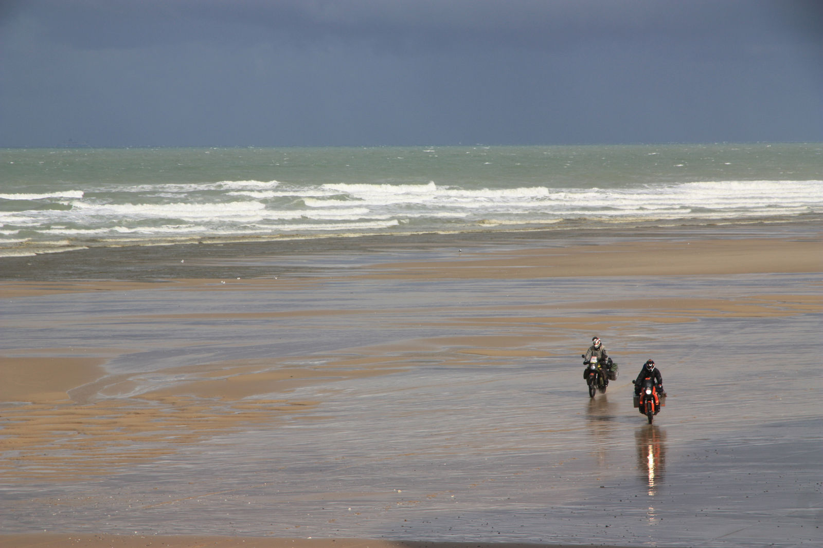 Kurz vor Ostende, der Ort an dem unsere Fähre fährt, wir sind auf der Outobahn (oder einen fetten Bundesstraße). Eine rote Ampel – wir stellen uns auf ein Beschleunigungsrennen ein. Ich stehe vorne, Ampel springt auf grün, ich ziehe los – die anderen nicht – verdutzt werfe ich einen kurzen Blick nach hinten. Im Blickwinkel sehe ich ein Blau Weißes Motorrad mit Rundumleuchte. Heinz startet los, einige Meter auf dem Hinterrad. Au Mann, er hat den Beamten nicht gesehen. Atzimuth und ich fahren langsam hinterher, unsere Blicke sagen das gleiche „er wird gef**kt“.