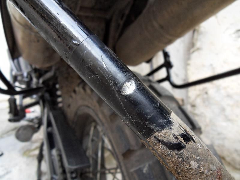 Nachdem viele von Euch in Deutschland eh gerade am Schrauben sind und so wie ich auch den KTM (TT) Kofferträger angebaut haben: checkt mal Euren Querträger (Stabilisations-Rohr, wie auch immer)! Ich hatte schonmal ein doppelt gelegtes Stück Reifenschlauch dort mit Iso-Band fixiert, wo der Spritzschutz auf den Querträger trifft, da ich vor ein paar Monaten schon tiefe Spuren geoutet hatte.