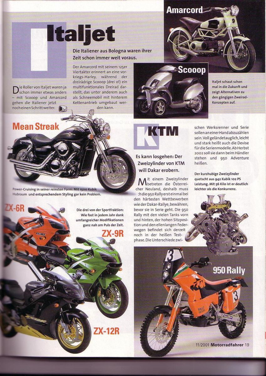 Aber schöne Artikel, mir ging es damals (2001) quasi genauso, nur ging mir die Kawasaki ZX12R im Kopf rum, 2003 war Sie meins Mr. Green