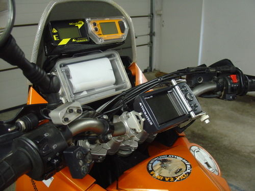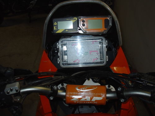 Der Roadbookhalter braucht viel Platz, ist der entscheidende Faktor. Am einfachsten ist, ihn mittig auf dem Lenker zu befestigen, dort ist er auch am geschütztesten bei einem Sturz - aber man muß bei der Navigation immer sehr weit runtergucken, was bei schneller Fahrt nicht der Bringer ist, sondern ernsthaft gefährlich, sofern man nicht auf Geschwindigkeit verzichten will. Du kannst ihn auch ganz oben, sogar an einem Geweih, befestigen, da ist die Sicht drauf viel besser, aber bei einem Sturz ist es so exponiert ziemlich gefährdet - blöd, wenn eigentlich fast nix passiert, aber der Navigationskram demoliert ist, dann kann der Rallyetag vorbei sein und Du mußt abends viel basteln. Der Roadbookhalter hat Gewicht, bei tagelanger Rüttelfahrt muß es trotzdem stabil befestigt bleiben - meine erste Konstruktion hätte sich nach zwei Tagen fast verabschiedet. Ach ja, auch hier gilt: Trickreich oder robust? Bewährt hat sich der relativ simple, aber robuste MD-Roadbookhalter.