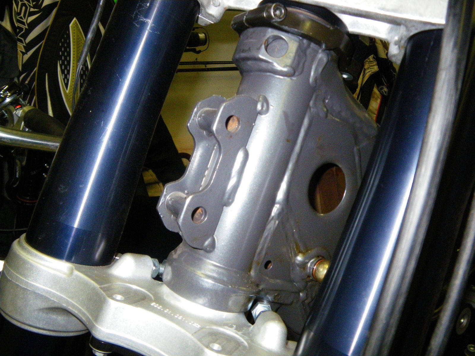 Die Vorbauhalterung sollte rahmenfest sein, das heißt nicht mitlenken, da das einerseits mit einer starren Verkleidung nicht allzu gut hinhaut und andererseits weitaus stabiler ist. Das Problem war, dass ich an meinem Enduro-Rahmen keine angeschweißten Halterungen am Steuerkopf habe, wie es zum Beispiel die Adventure serienmäßig hat. Da ich ungern meinen Steuerkopf durchlöchern lassen wollte, war ich ein bisschen erfinderisch und habe mir die Löcher hinter dem Steuerkopf zu Nutze gemacht(zu irgendwas muss ja ein Ingenieurstudium was taugen Mr. Green ).