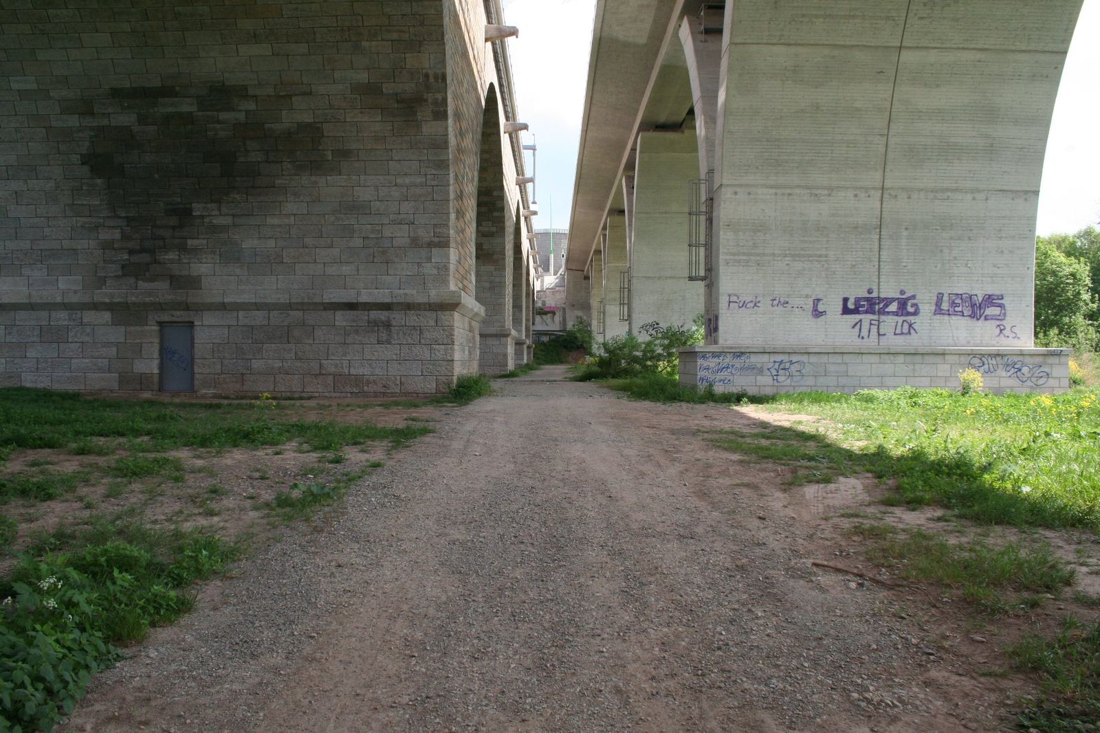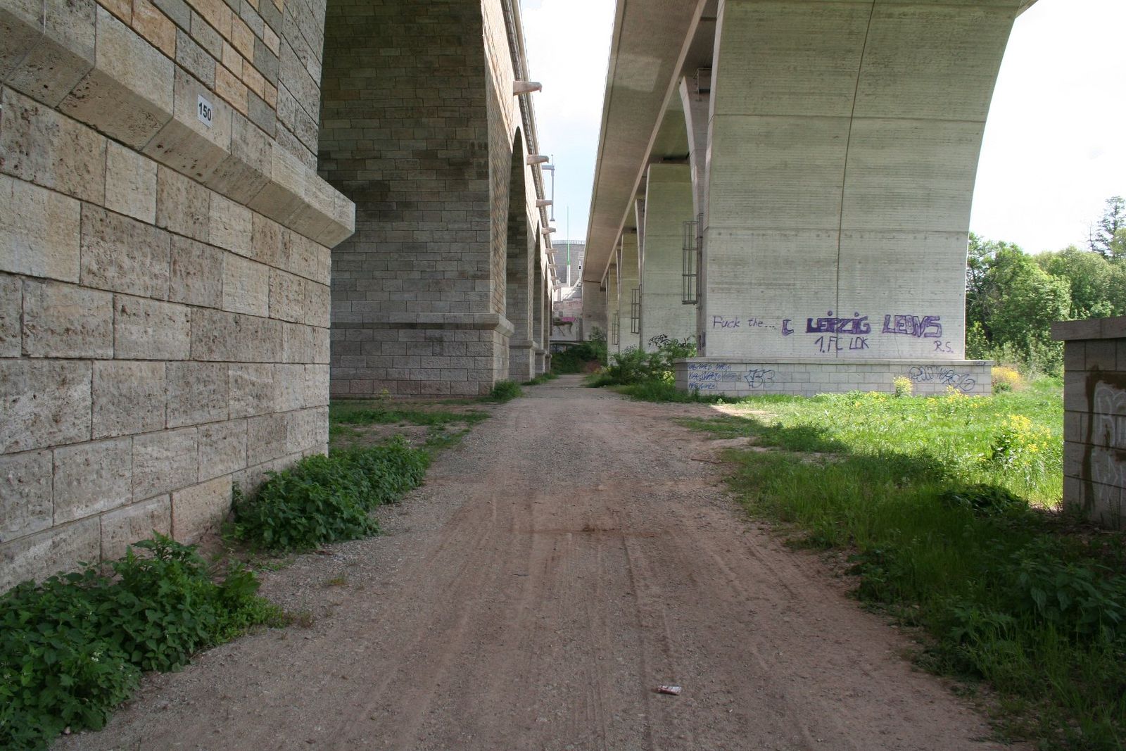 man kommt entweder über maua oder rutha über die ortsverbindungsstraße zur einfahrt richtung brücken. an der einbiegung stehen keine verbots- oder gebotsschilder. per anfahrtsweg (unbefestigt) kommt man genau auf den weg, der unterhalb der beiden brücken parallel-mittig verläuft. biegt man, wie ich es gemacht hab nach links kommt man am ende zur saale. der weg endet dort in goben schotter, steine und ohne kennzeichnung bzw. markierung (schotter - fluss). da die saale recht breit ist hab ich dort den fluss noch rechtzeitig erkannt und konnte anhalten. hab mich kurz umgeschaut, gewendet und bin den weg zurück über die kleine t-kreuzung richtung anderes ende des weges/brücken gefahren. meine geschwindigkeit kann ich im nachhinein schlecht abschätzen. auf jeden fall hab ich gerade aus richtung ende des weges beim fahren geschaut unnd wie ich runter schaue hört ohne vorherige kennzeichnung/vorwarnung der weg auf und mitten durch den weg fliesst ein bach. ich bin zwar voll in die eisen (abs war ausgeschaltet) hab aber im endeffekt nicht geschafft vor der böschung zum stehen zu kommen. ich bin über die böschung in den bach auf ein kleines steinwehr geknallt. machine ist leicht nach links weg und ich bin kopfüber auf das wehr und hab mir dabei die schulter geprellt. maschine ist einen meter bachabwärts und wurde unter wasser gezogen. ich hab sie sofort wieder aufgerichtet aber mehr ging nicht. den rest in kurzform - adac angerufen ... nee wenn das kein öffentlicher verkehrraum ist können wir keinen schicken ... 110 angrufen .. 2 streifenwagen .. krankenwagen - nein ich verweigere die mitnahme ... feuerwehr - och die steht doch gut da drinn, da ist bestimmt nix ausgelaufen ... dann doch adac gekommen ... rausgehoben ... kiste nach hause gefahren ... frau schimpft - was fährste auch im dunkeln so schnell da rum ... kotz kotz. so nachdem ich schultermäßig wieder einigermaßen fit war bin ich nochmal hingefahrenund hab alles fotografiert. vor allem wollte ich wissen ob da irgdenwelche schilder stehen oder irgend ein hinweis auf mögliche gefahren. nichts. das ist tatsächlich öffentlicher verkehrsraum. jeder kann und darf da rein und rum fahren. dann hab ich ausgemessen (grob) ab wann man den bach als solches erkennt. so ab ca 22m sieht man, das mit dem weg was nicht stimmt, da zieht sich auf einmal ein dunkler strich durch und ab 20m sieht man die ersten böschungssteine und ich denk mal ab der entfernung erkennt man die gefahr. ab ca. 11m erkennt man einen graben und ab da wird klar das da ein bach ist. ich häng hier mal die bilder mit den metern drann, da wirds dann deutlich. so das zur beschreibung.