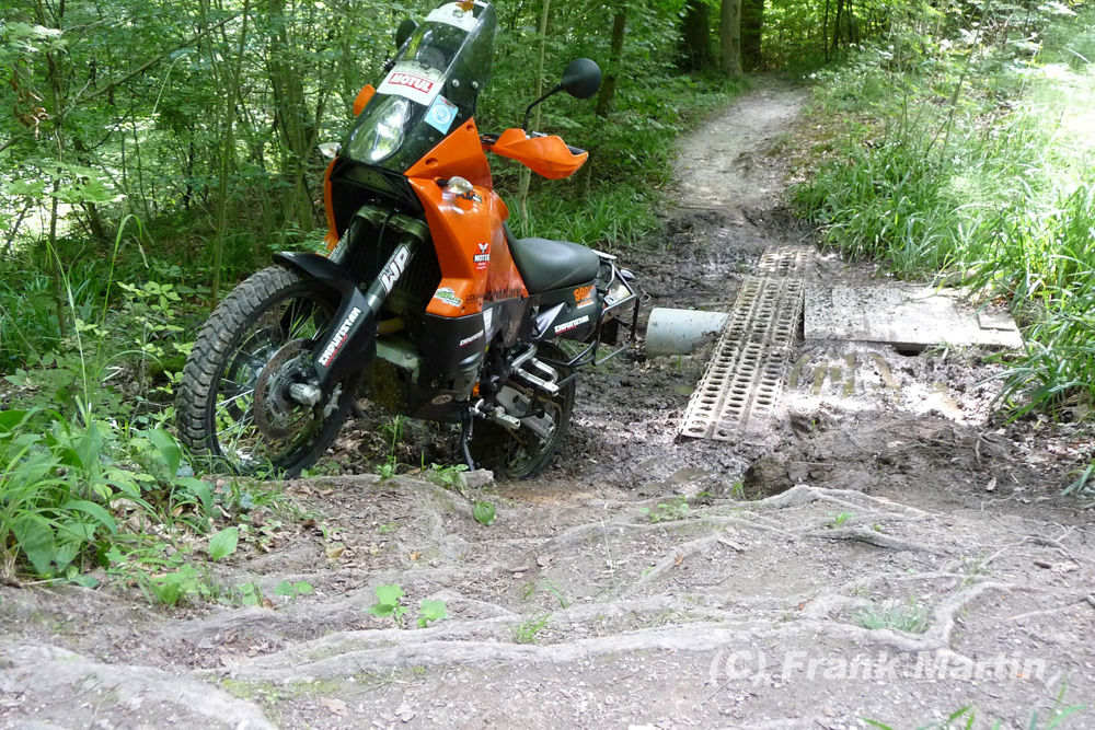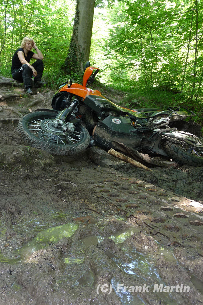 Oh, da vorne siehts aber bissl knifflig aus, das Lochblech als Brücke ist breit genug, 30cm vielleicht, hüben und drüben Matsch, danach gehts über querliegende Wurzeln hoch, ohje, das ist aber steiler als ich dachte, ein Baum steht auch blöde im Weg ..... denkste, die Wurzel iss zu hoch, die Kiste steht, steil nach oben. keine Chance vorwärts, rückwärts gehts in den Matsch, denn den Hintern der Käthe hats schon zur Seite gesetzt.