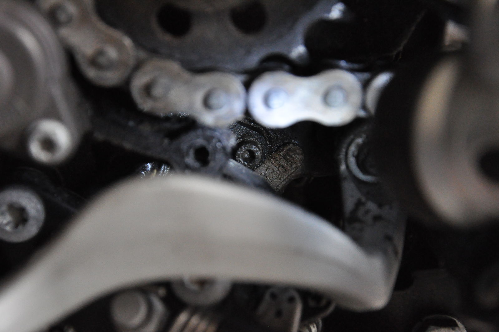 Weiter oben hinter dem Schalthebel ist etwas in den Motor geschaubt, fast mittig unterhalb des Ritzels. Drei verschiedenfarbene Kabel führen dort von vorn hinein. An der hinteren Schraube ist glaube ich ein Massekabel angeschlossen. Das Teil ist mit zwei Schrauben? befestigt, wird teilweise durch das Kabel vom Seitenständerschalter verdeckt.