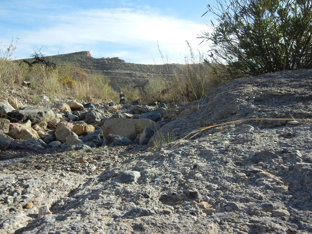Der Desierto de Tabernas ist in der Tat die einige Wüste Europas. Im Moment relativ grün, die Gräser zeigen an, vor Kurzem muß es geregnet haben. Aus ungewohnter Sicht findet 123joe es trotzdem enorm kahl - und im Grunde hat er recht. Mir, der ich schon oft und lange hier war, fällt eher das ungewohnte Grün auf. Es ist eine Lehmwüste, mit Einsprengseln von vulkanischem, Kalk- und Sandstein, in den Ramblas zu grauen Kieseln zerrieben, deren Geologie ich nicht deuten kann.