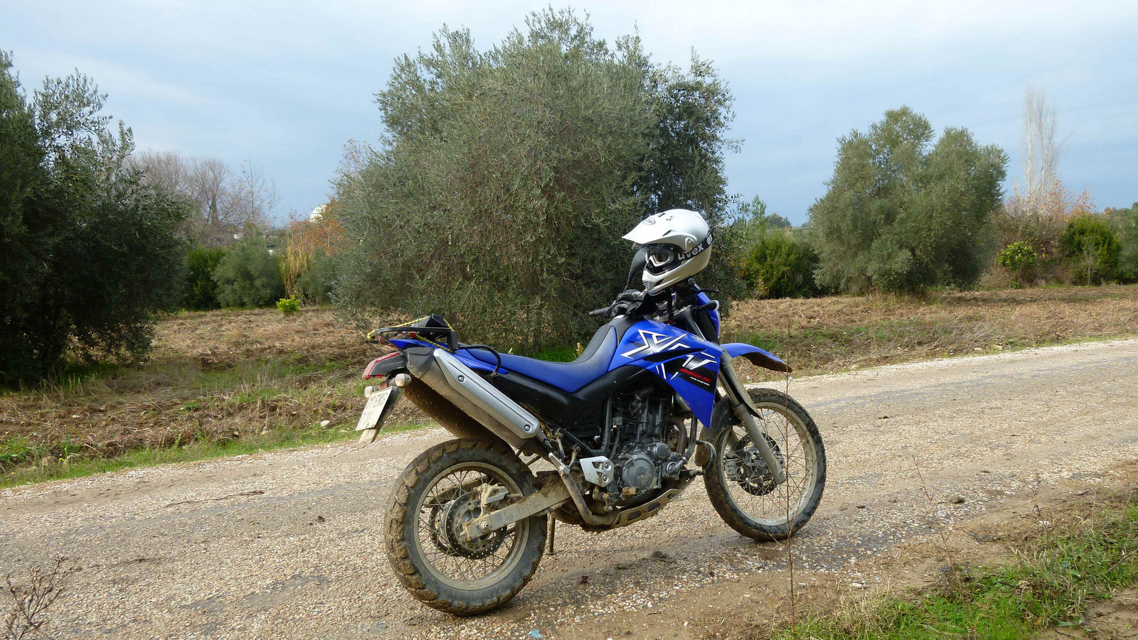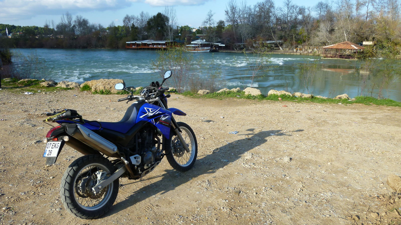 Mit leichter Verspätung kam die Yamsel an, alles gut, der montierte Metzeler ENDURANCE hat noch bestenfalls 40 %, das is nich so dolle, nun, geht noch, weil’s trocken ist. Kurze Proberunde zum Strand, darauf gabs einen leckeren frisch gepressten Granatapfel-Saft. Das Motorrad hat guten Druck, klingt vernünftig und die Sitzposition passt, meinen TT-Halter samt Oregon mit Openmtbmap-Türkeikarte problemlos montiert. Im Gegensatz zu der BMW F 650 GS-Gießkanne die ich mal auf Madeira hatte.
