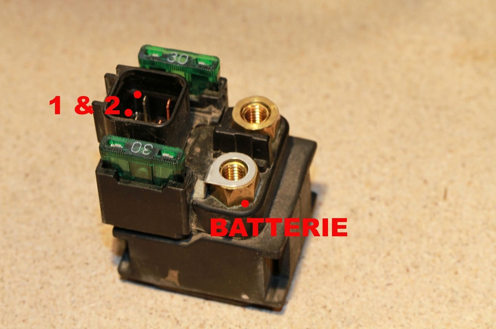 Variante 1: Klemme 1 & 2 (die Silbernen) zum Batterie Plus (mit der Silbernen Blechbahn) Brücken, dann kannst Du ohne Relais fahren - Brauchst dann aber ne Kabelbrücke um kurz den Anlasser drehen zu lassen. Und denke dran das NORMAL ne 30A Sicherung dazwischen ist !