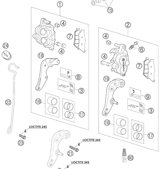 Unten sieht man die beiden Teile: Der mit den Kolben darin, Brembo steht drauf. Der andere heißt Brake Caliper Support. Die zwei sind auf eine für mich undurchsichtige Weise miteinander verschraubt - vermutlich, damit das Ganze "schwimmend" arbeitet: mit einer 11er Schraube und vor allem zwei Gummimanschetten, wahrscheinlich gegen Dreck. Ich möchte alles gründlich reinigen und fetten und sehen, ob's dann wieder fkt. oder ob ich den RepSatz brauche.