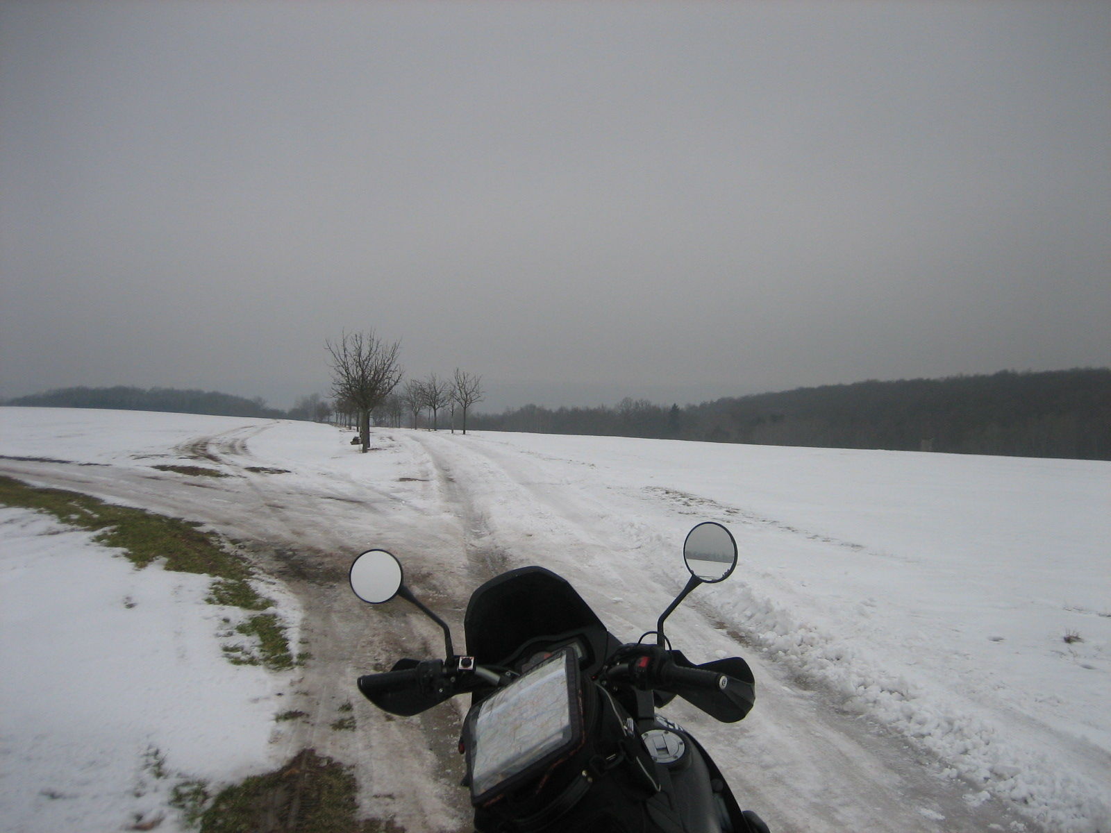 Nach 700km Überstellungsfahrt, also 3200km Laufleistung des Reifens, hatte ich beim vorderen kein gutes Gefühl mehr. 500km durchs G'hockte hatte ich ja noch zu fahren, also flogen die E09 runter und Karoos (gab nix anders Stoppliges kurzfristig) kamen drauf. Hat aber auch was Gutes, so hatte ich den direkten Vergleich Very Happy
