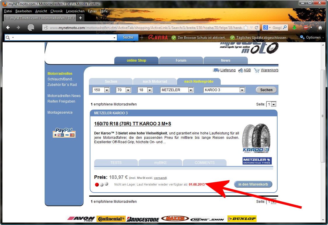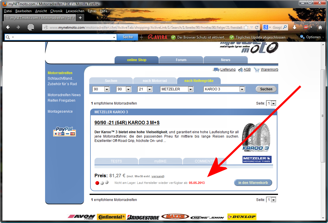 ich wollte gerade bei www.mopedreifen.de bestellen. Die Teile sind momentan nicht lieferbar. Hab dort angerufen und mir wurde bis mitte nächster Woche eine verbindliche Anwort zugesichert. Die Firma ist wohl heute Abend bei Metzeler zur Vorstellung des Karoo geladen.